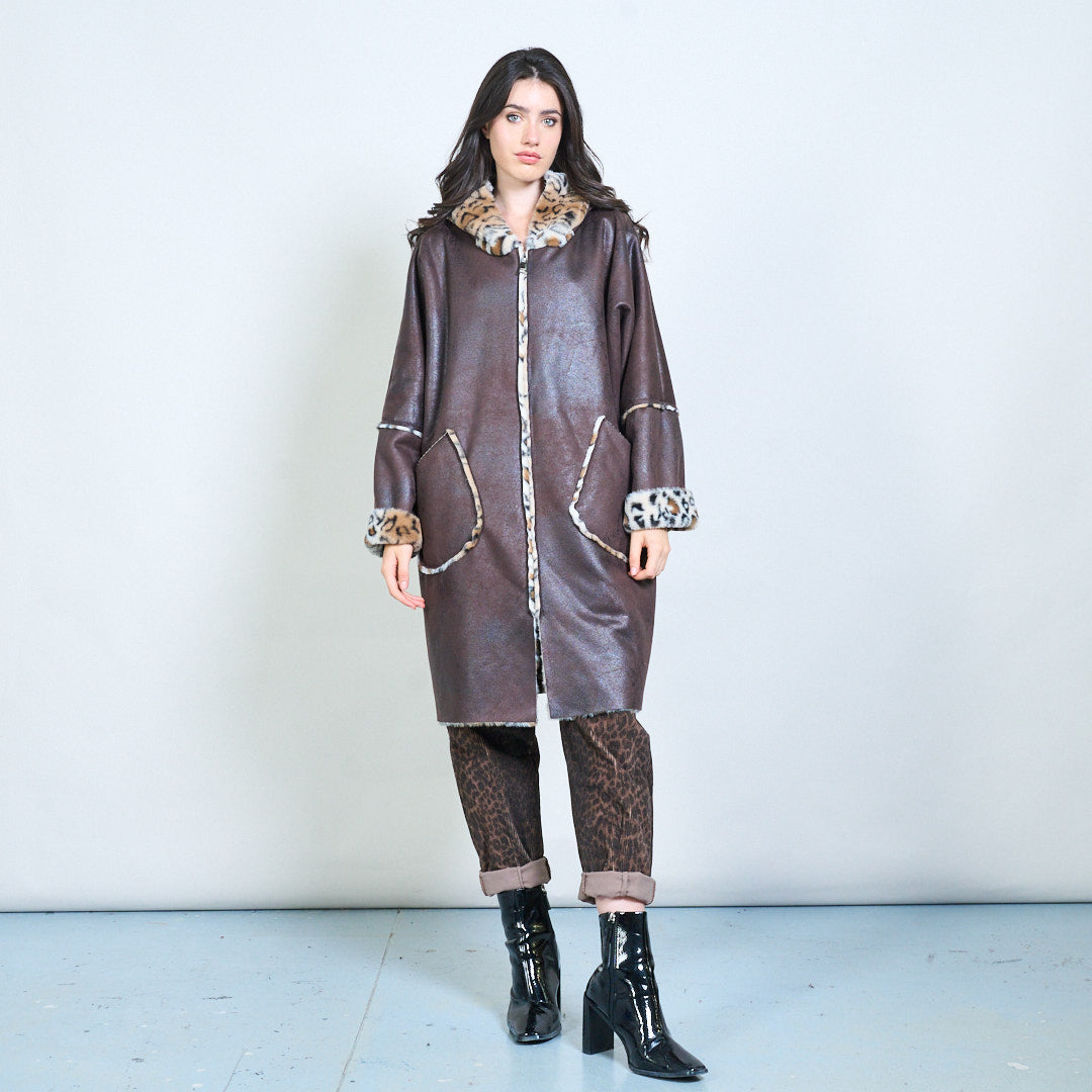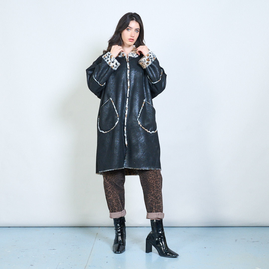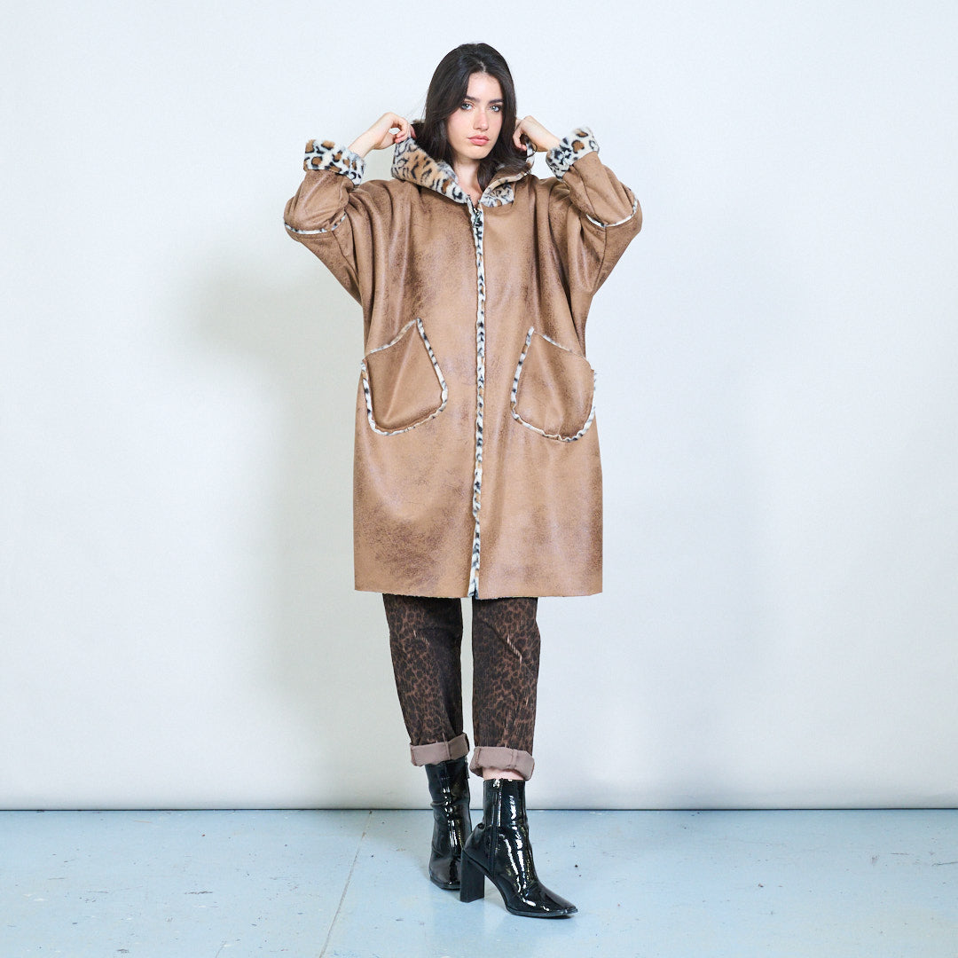 - Jaukus dizainas su gobtuvu, išklotas paryškintu leopardo atspaudu, skirtas išskirtiniam stiliui