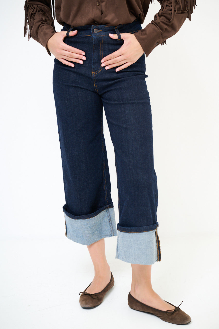 Plačiosios kojos rankogaliai džinsiniai džinsai su dideliu juosmens didmenine prekyba