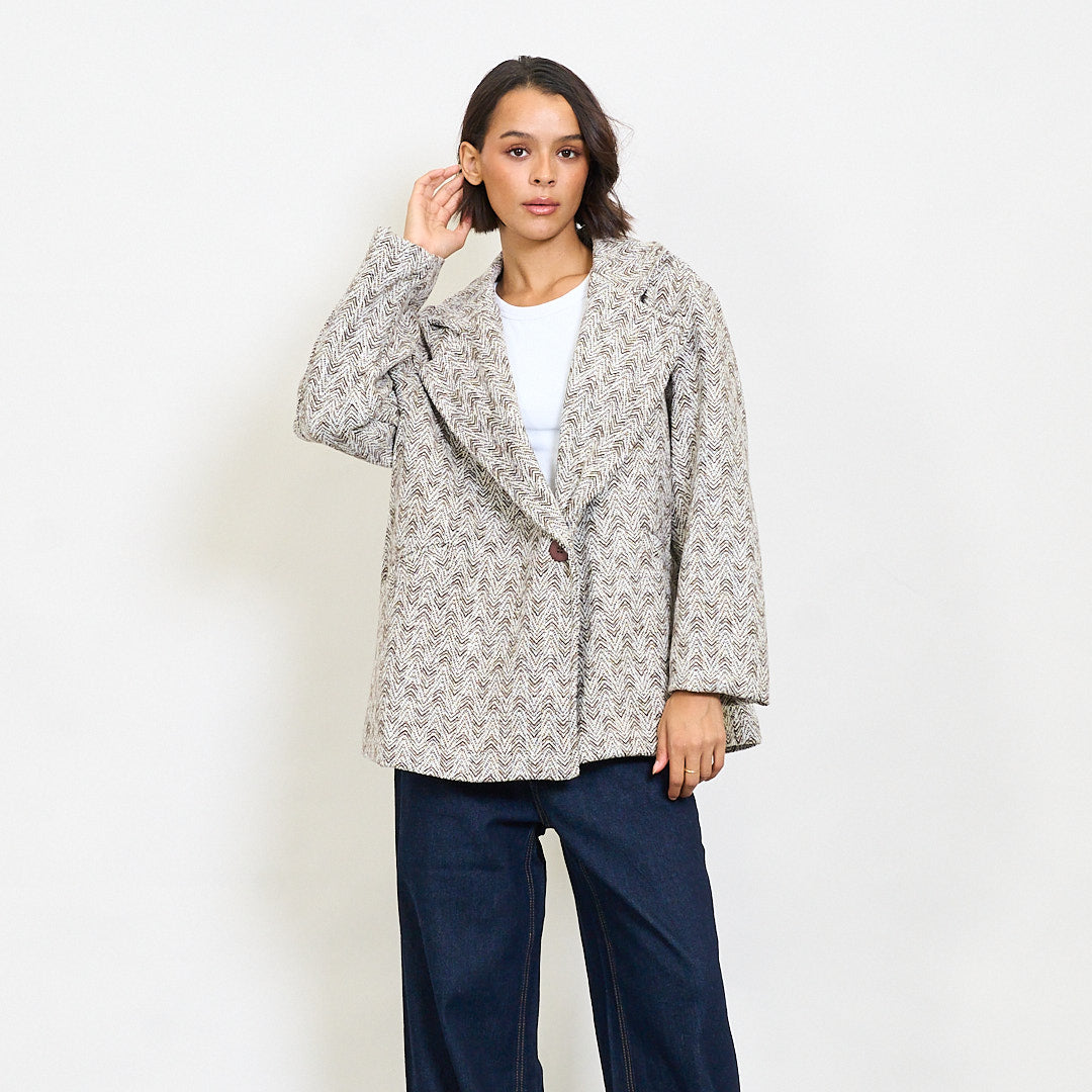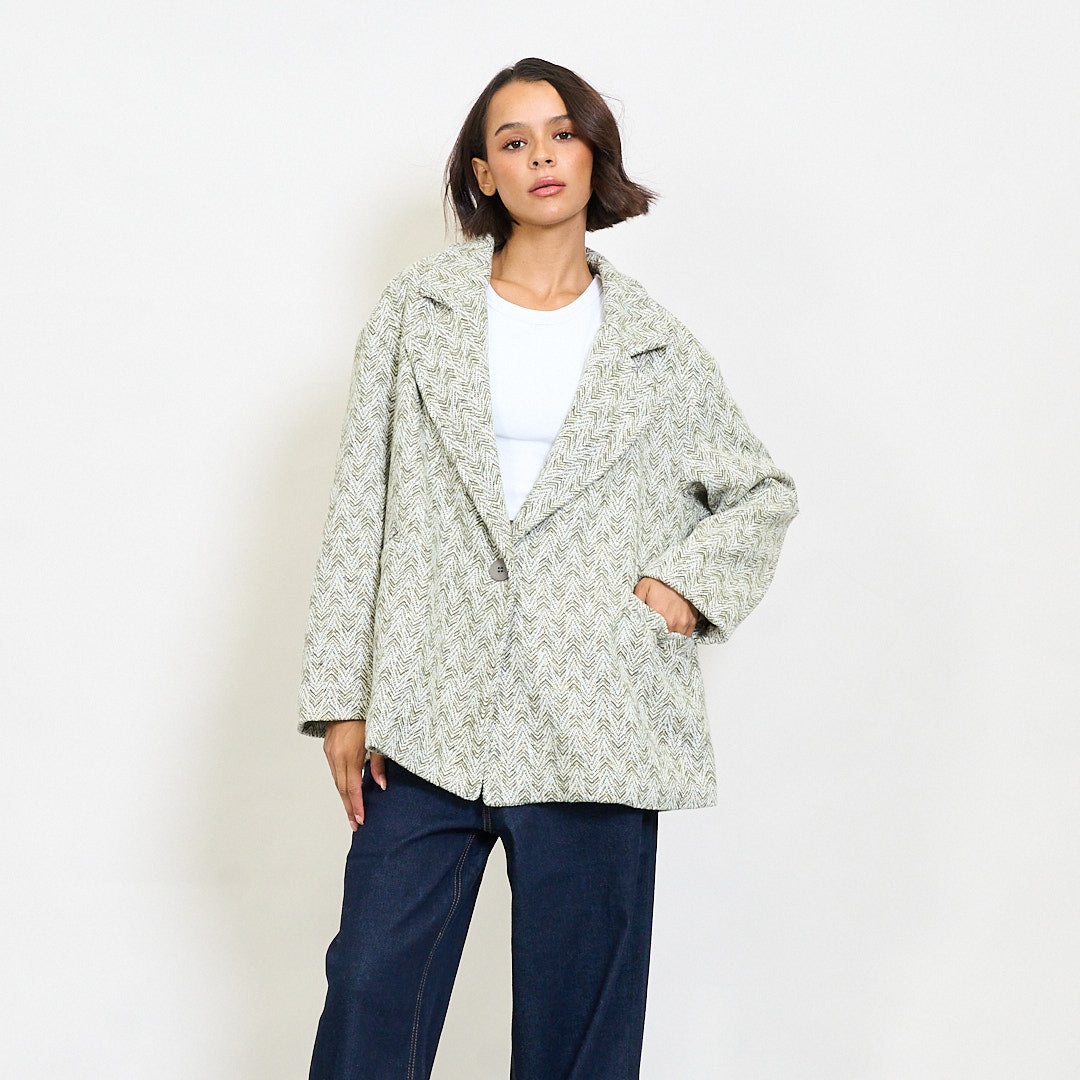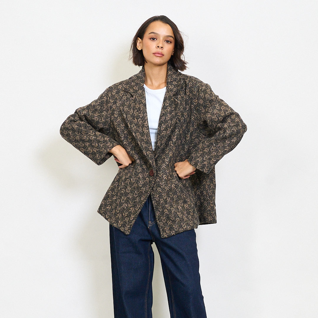 • Pritaikytas švarkas su paryškintu „Chevron“ silkės kaulo austi tekstūra