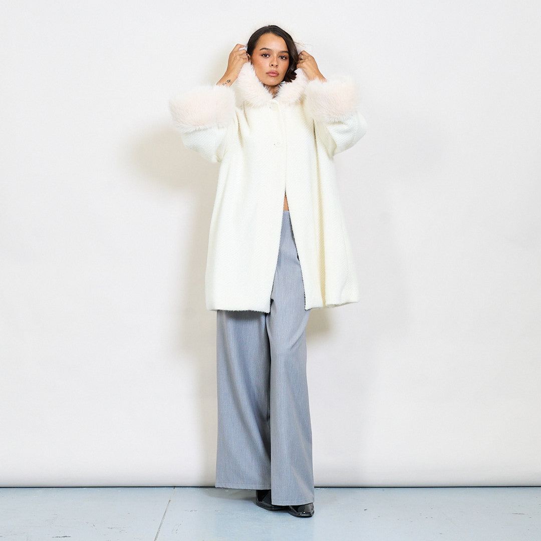 - Pliušinis dirbtinis kailio apykaklė ir rankovių rankogaliai, kad būtų elegantiška, jauki apdaila