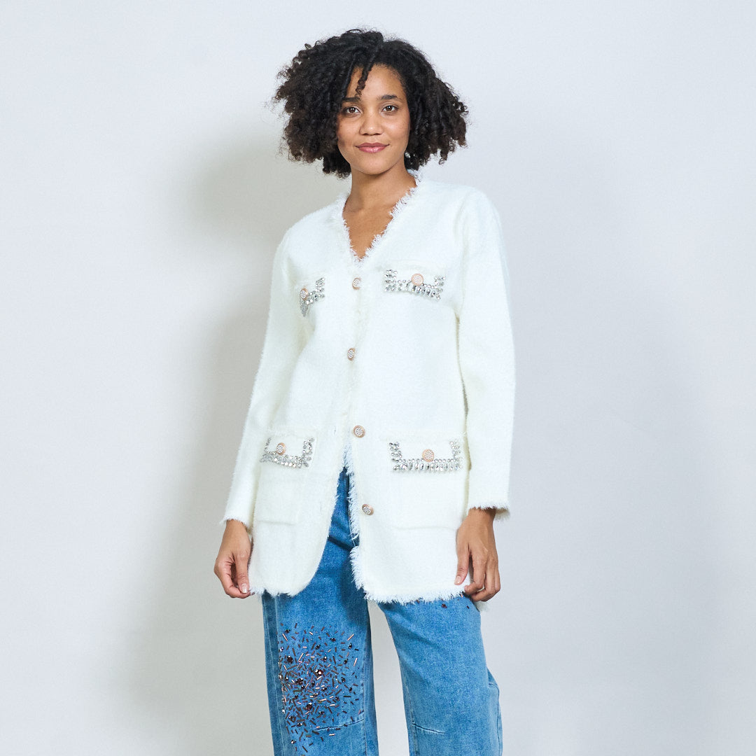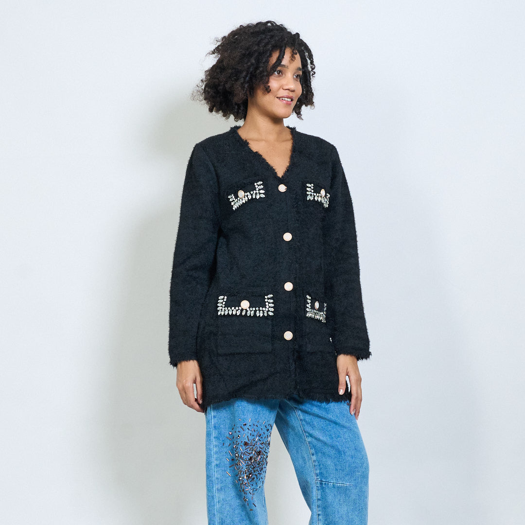- Savybės yra keturios priekinės kišenės, papuoštos brangakmeniais