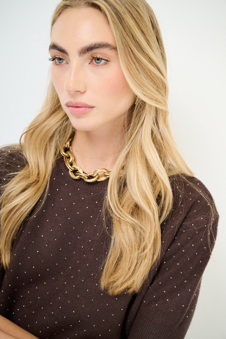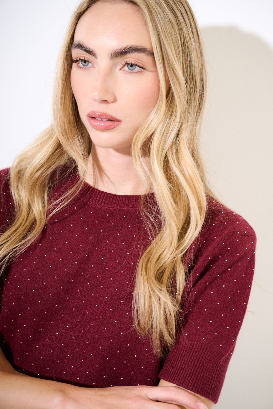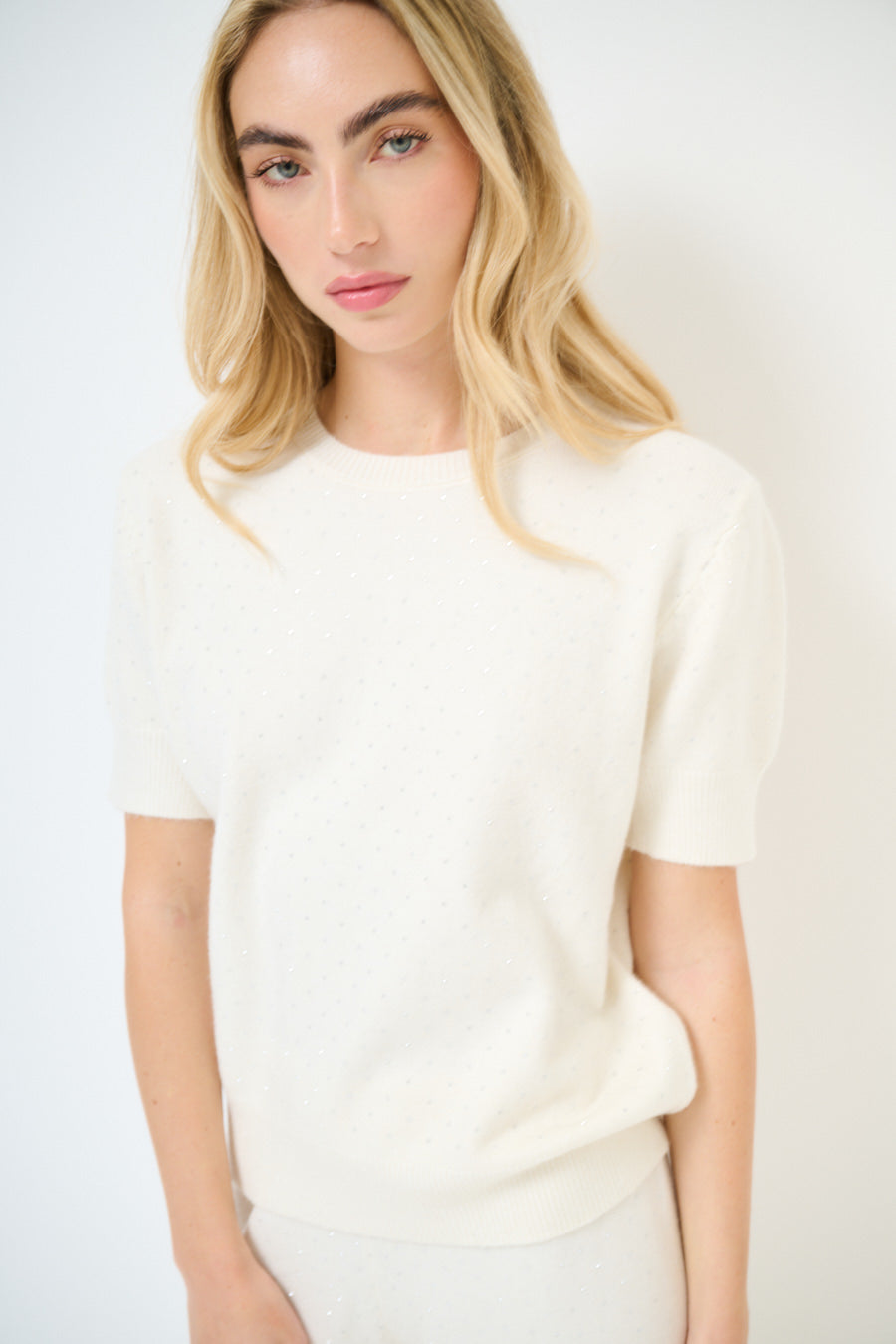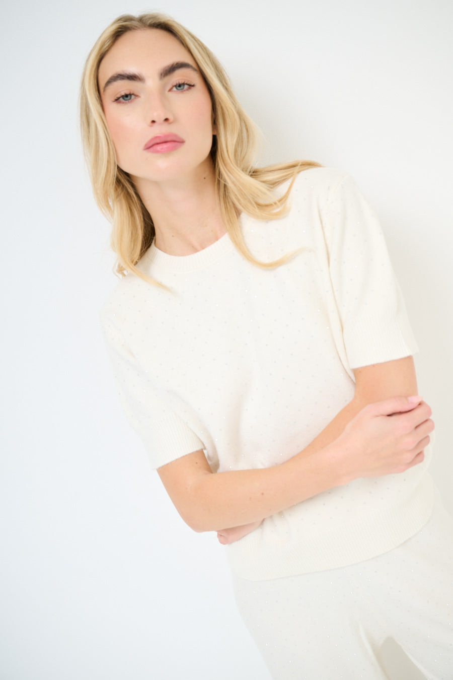 • Klasikinis trumpų rankovių megztas viršus su šiuolaikišku vingiu