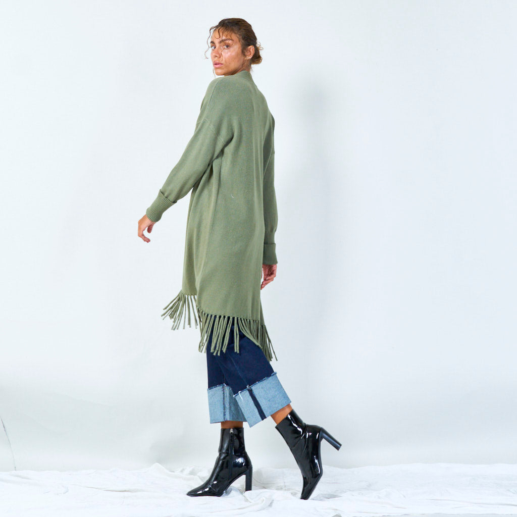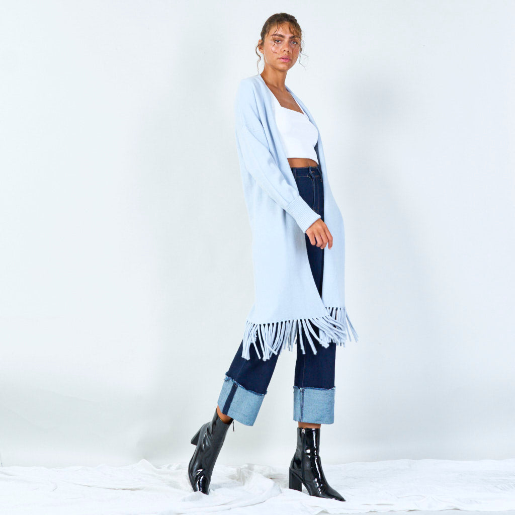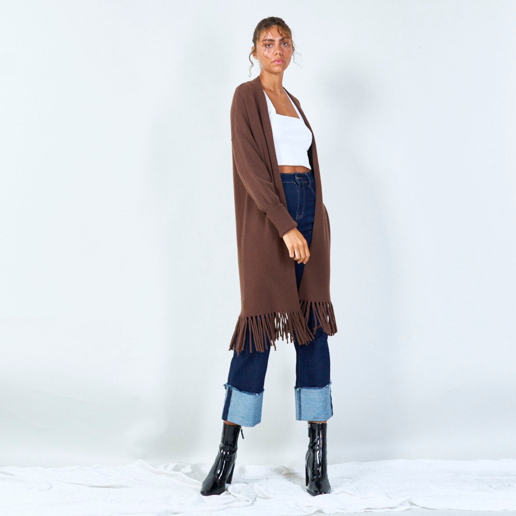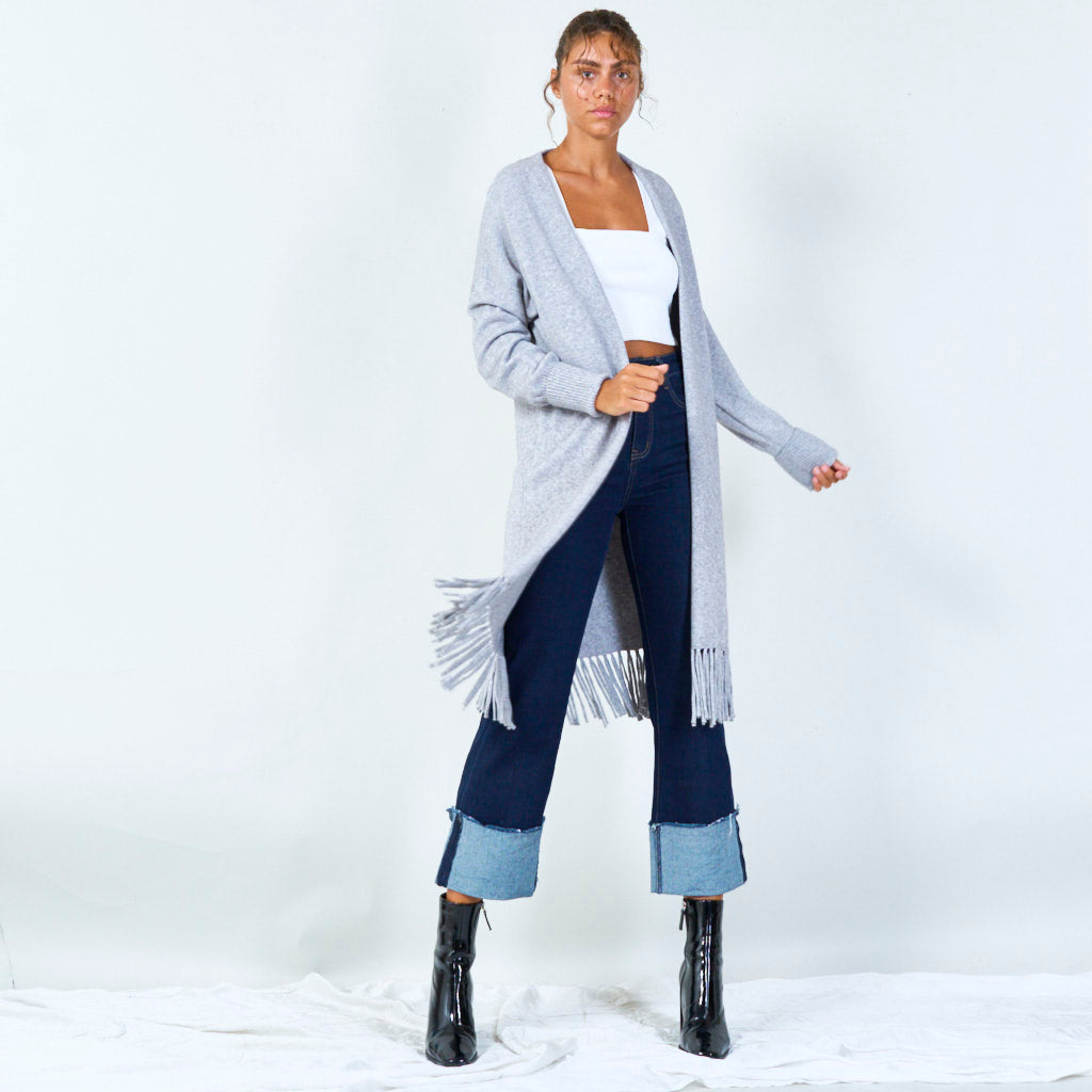 Ilgas megztas megztinis su didmenine dalimi pakraštyje