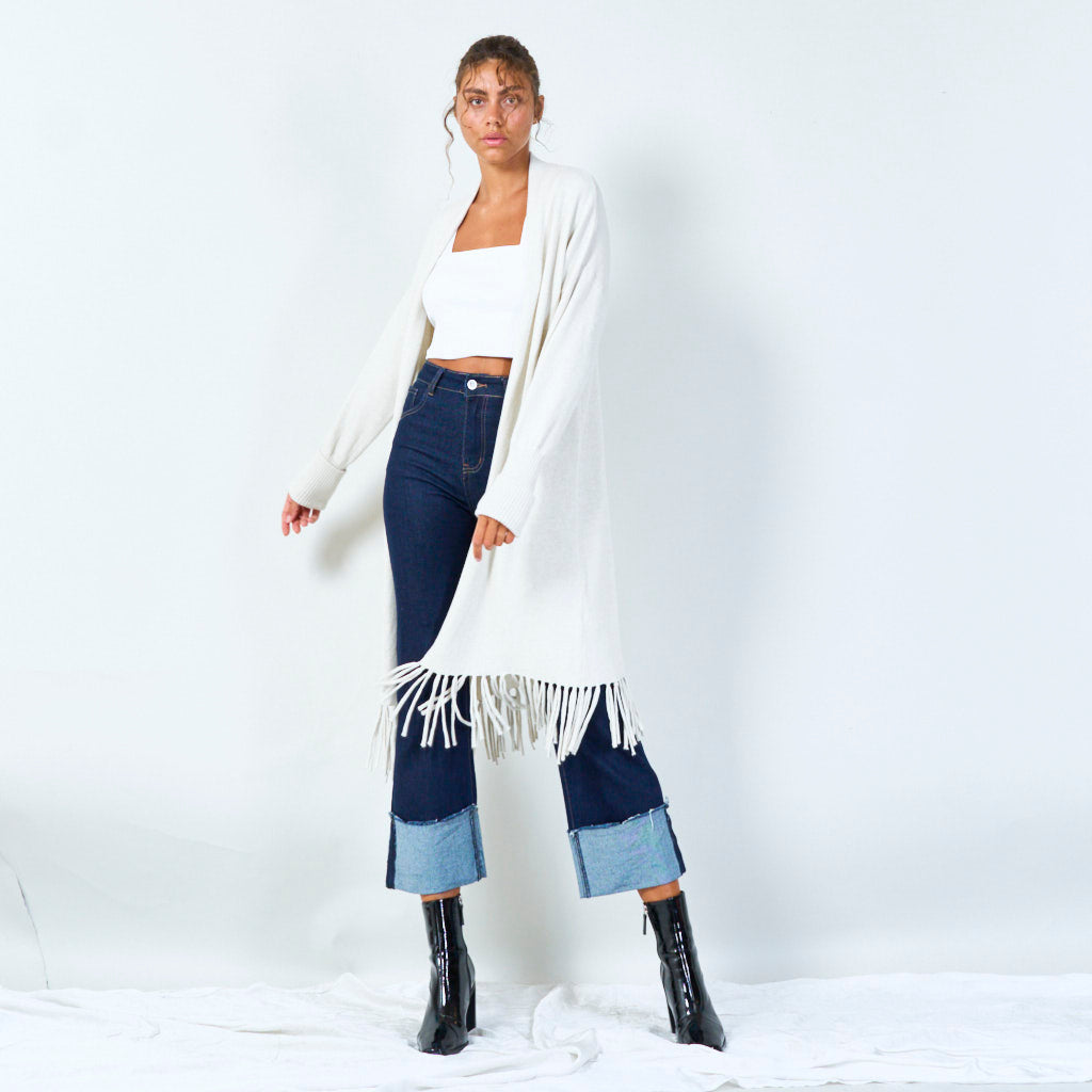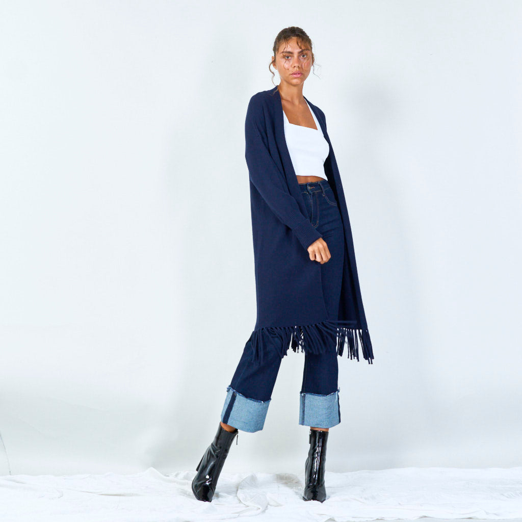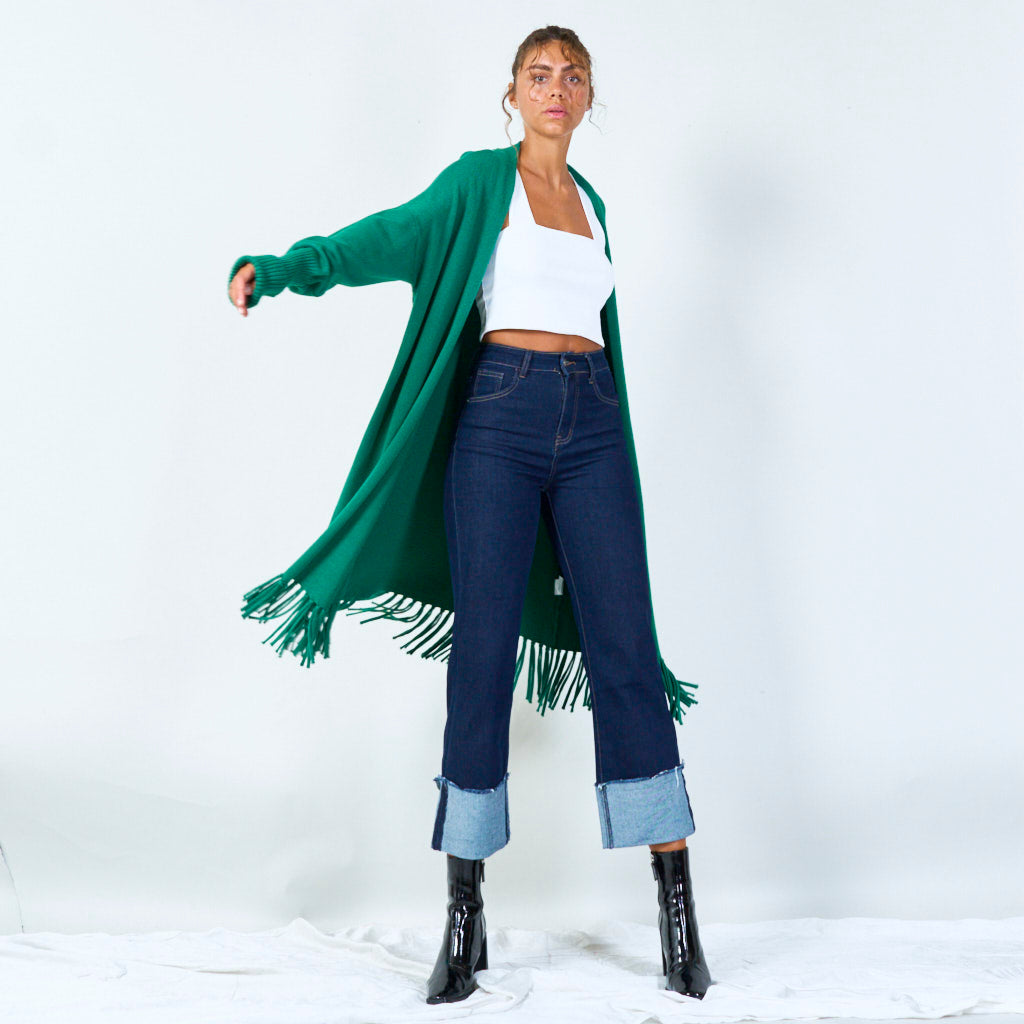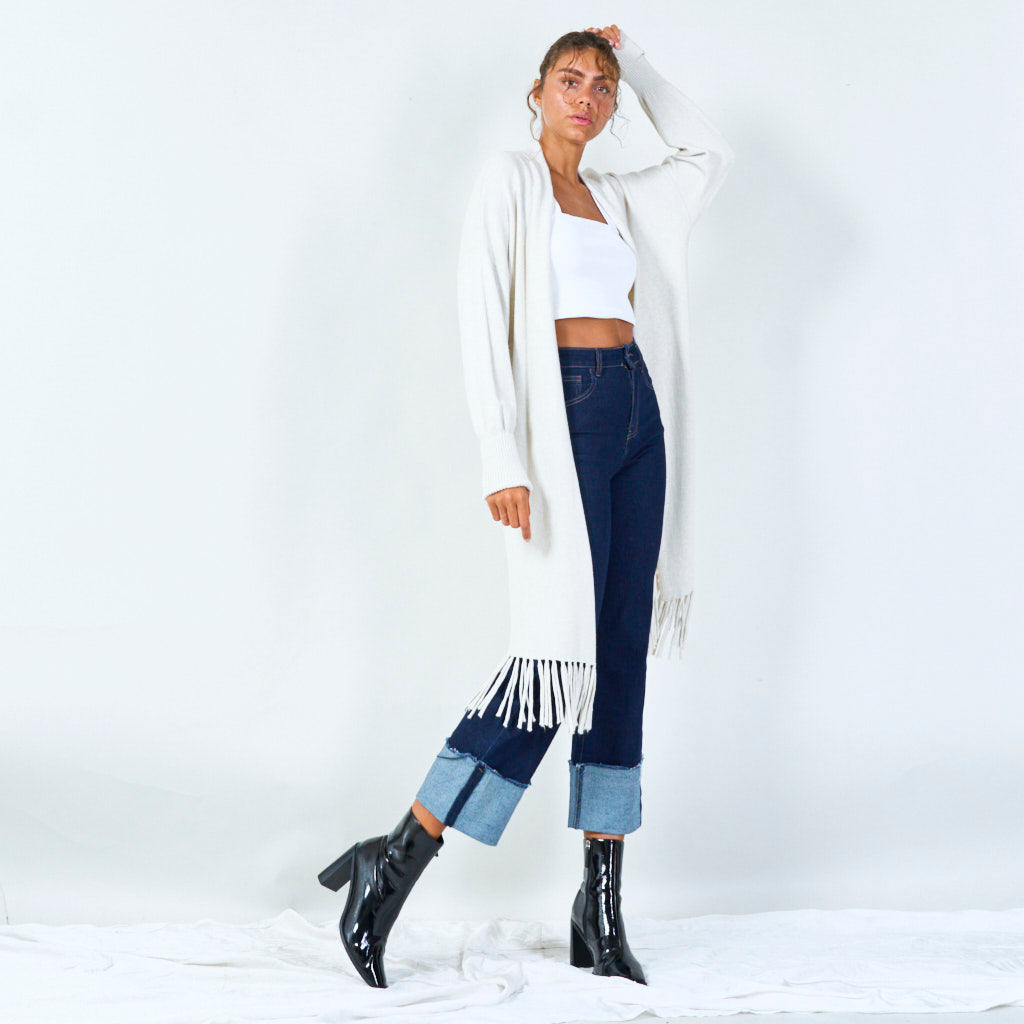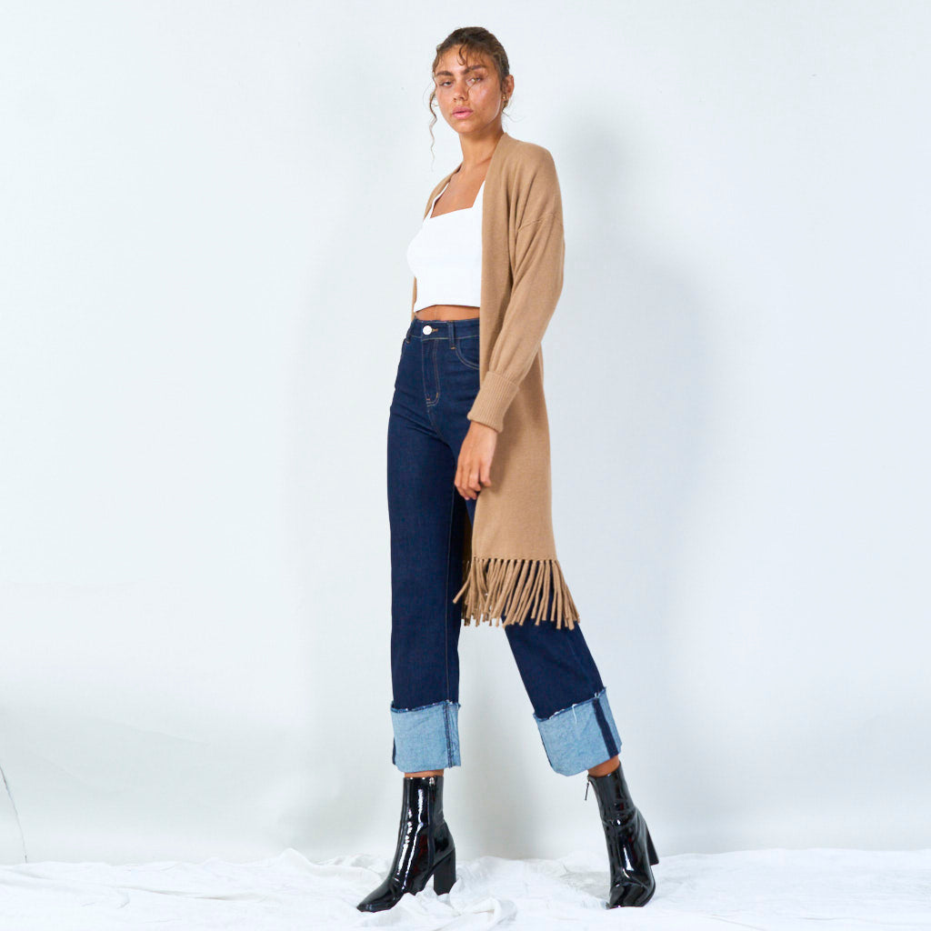 Ilgas megztas megztinis su didmenine dalimi pakraštyje