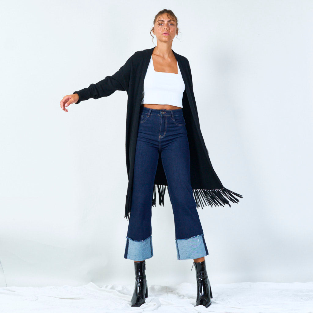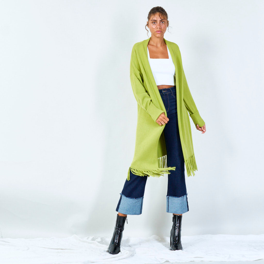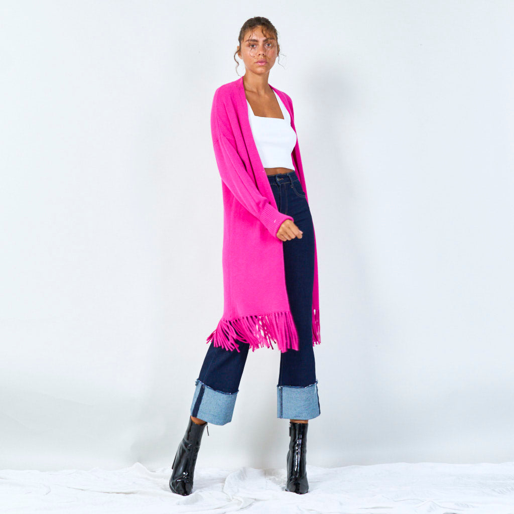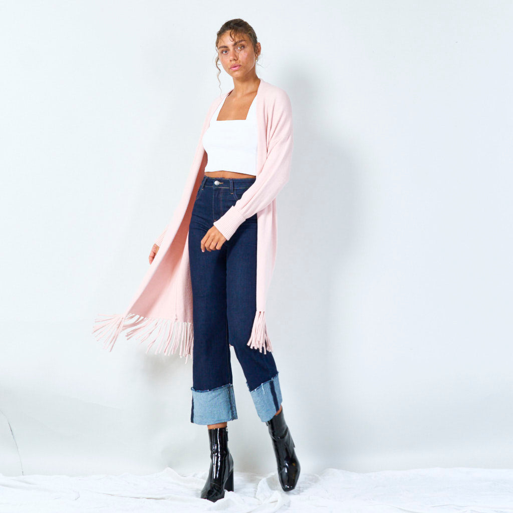 Ilgas megztas megztinis su didmenine dalimi pakraštyje