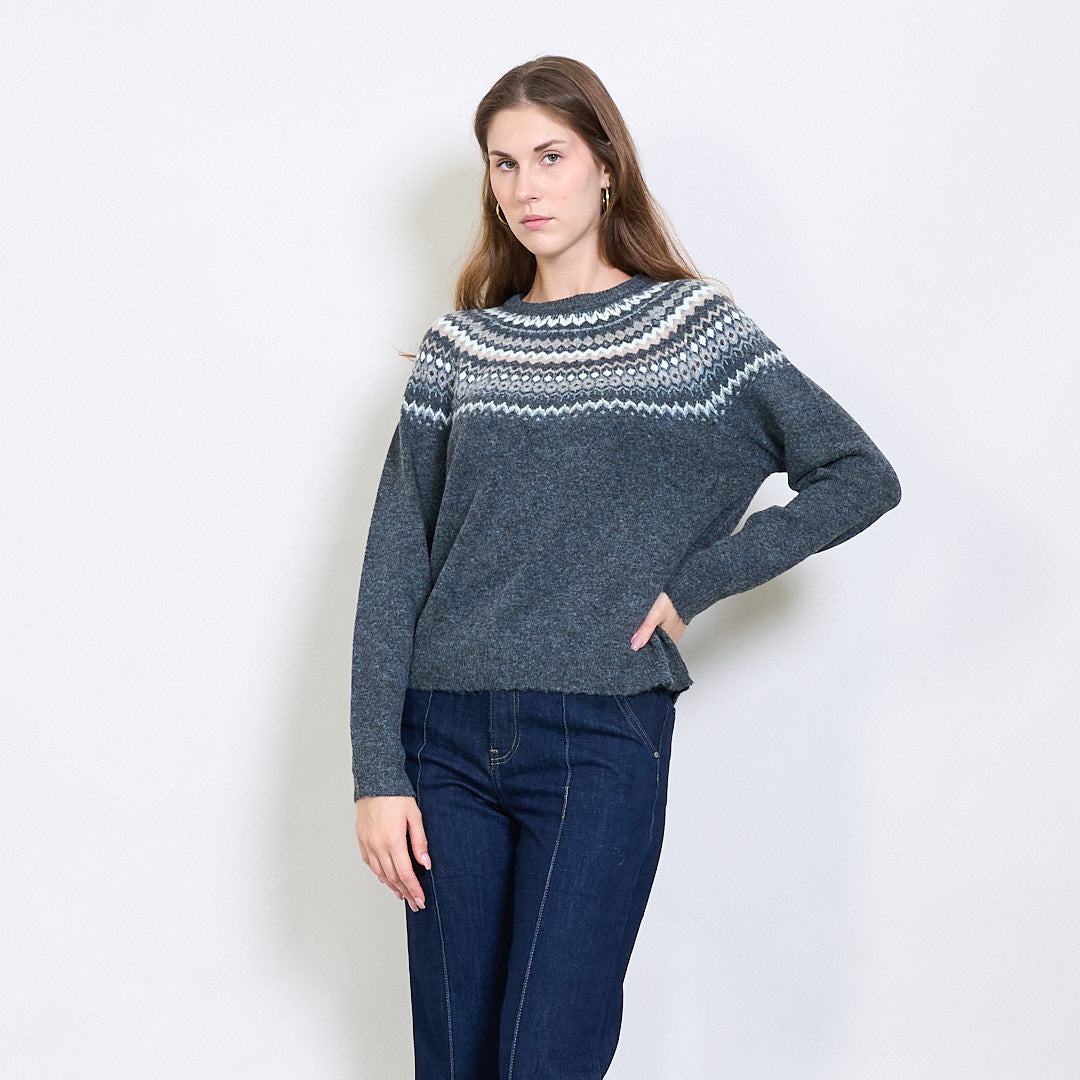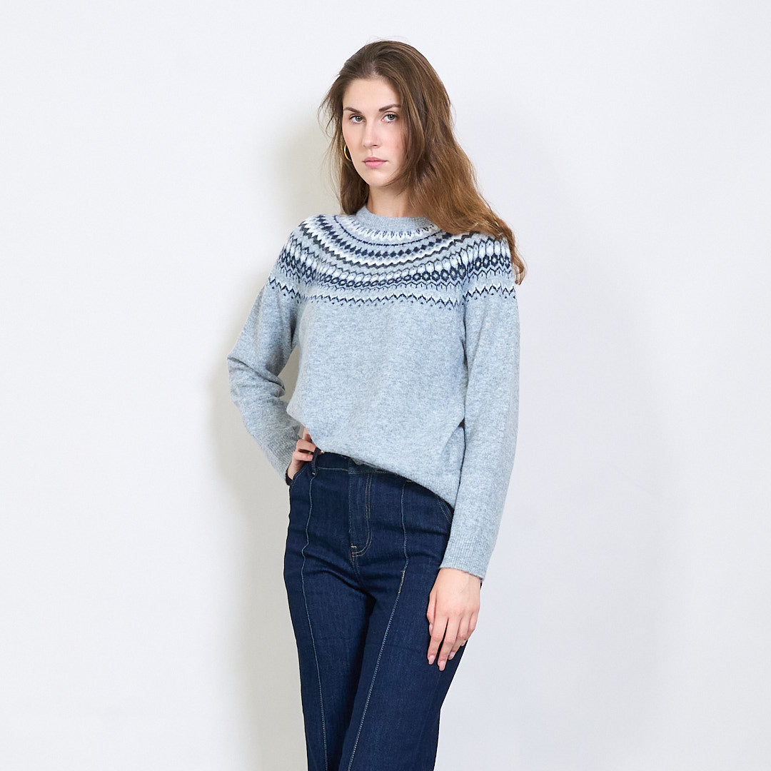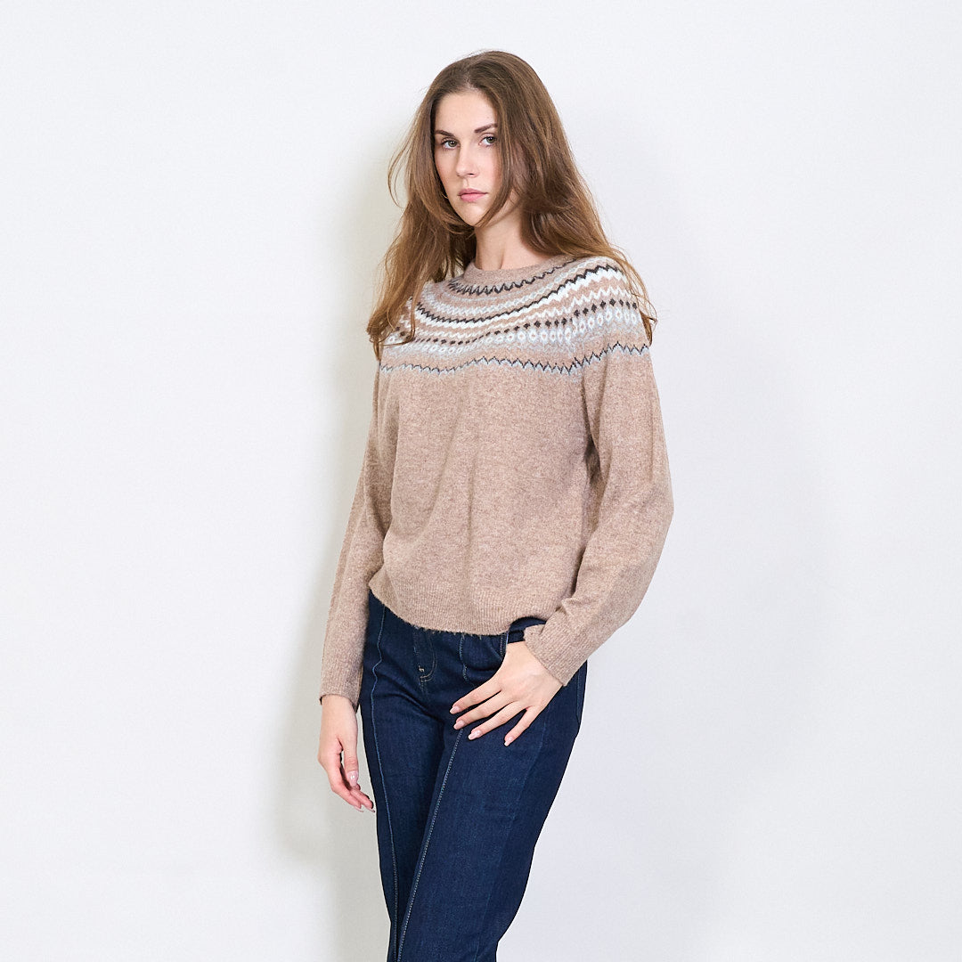 Fair Isle raksta apkalpes kakla džemperis ar rievotu apdari vairumtirdzniecībā