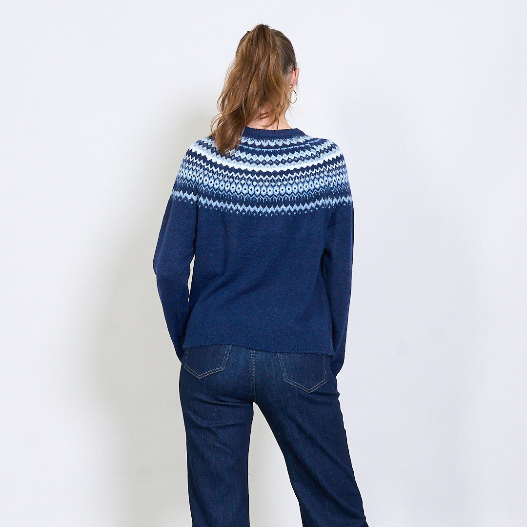 - Klasiskais gadatirgus adīts dizains visā jūgā un plecos