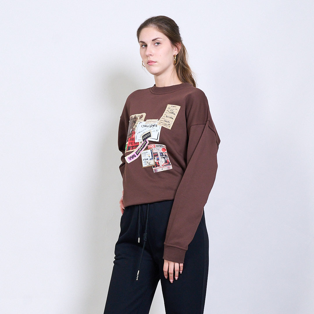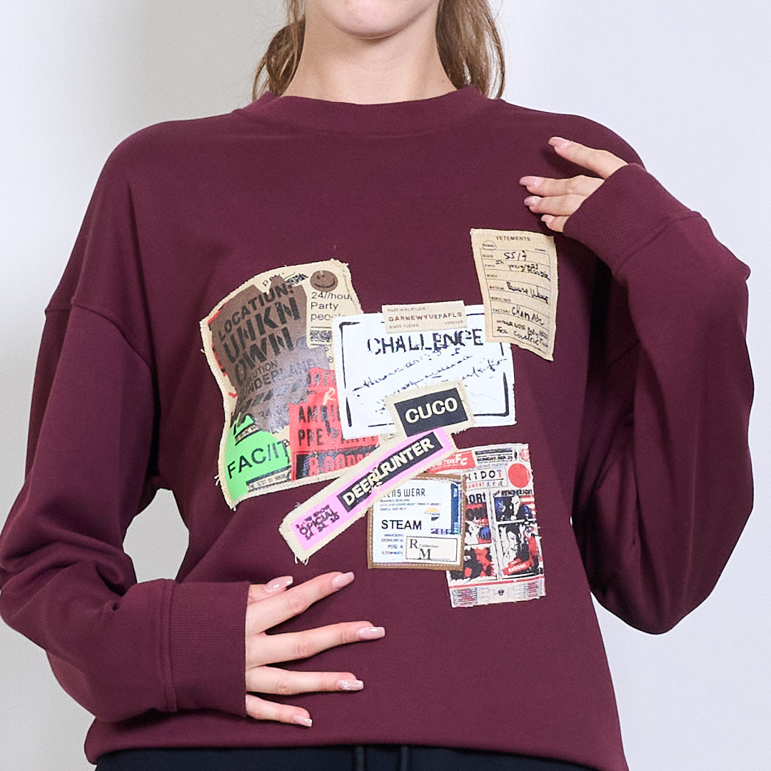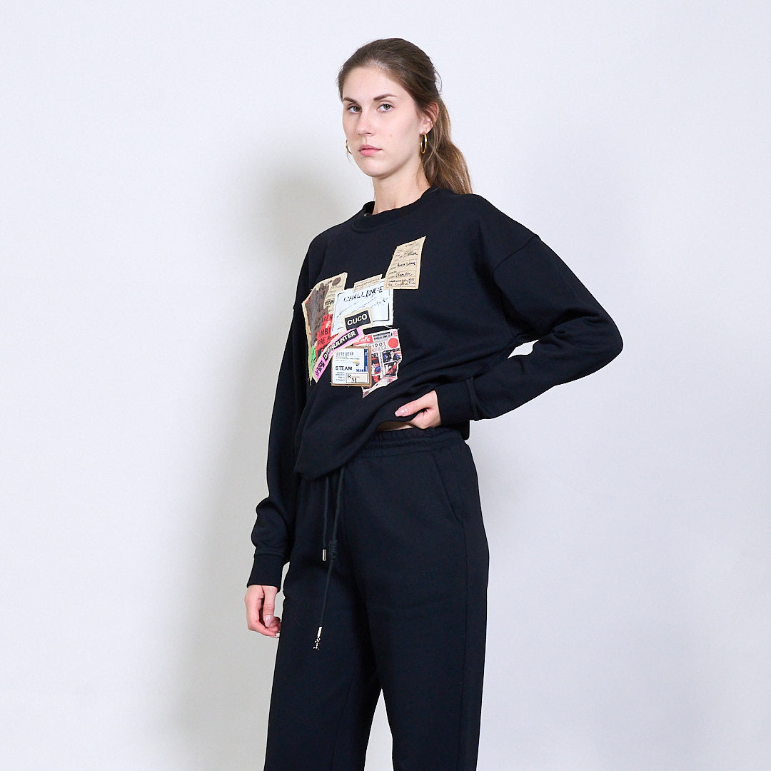 - Priekšējais panelis, kas dekorēts ar jauktu grafisko kolāžu plāksteri
