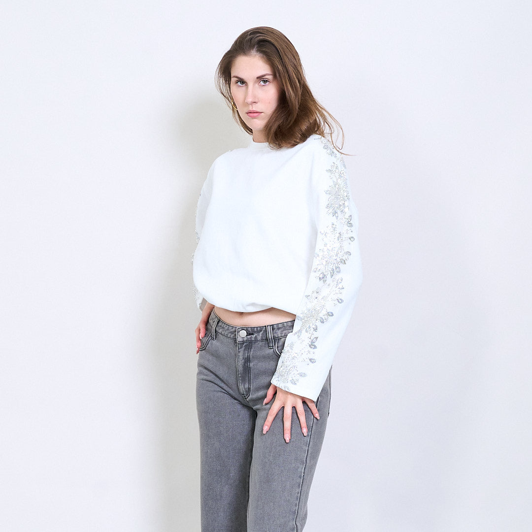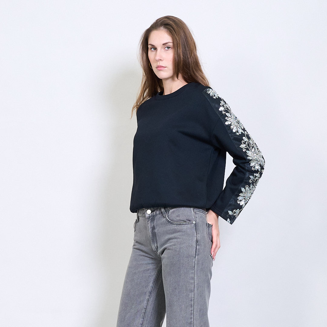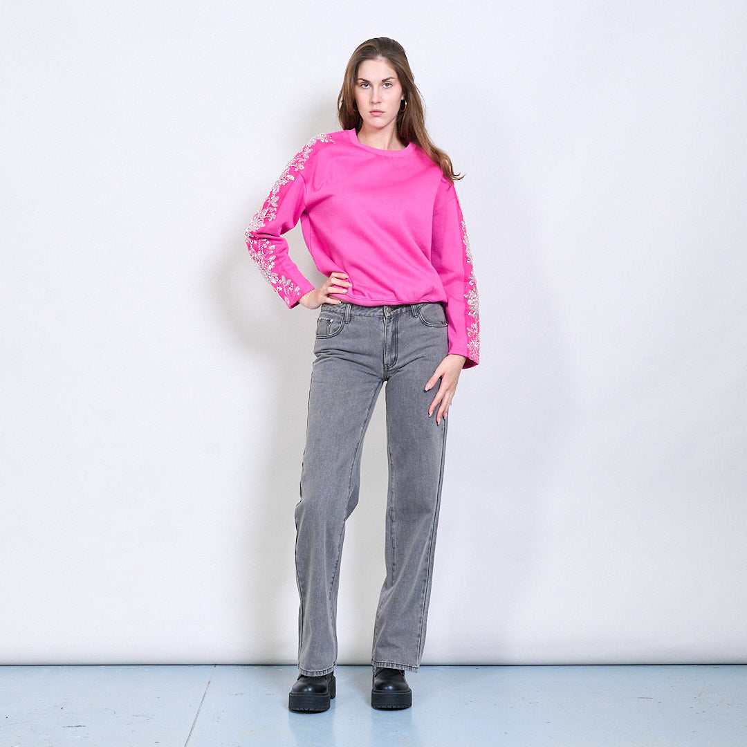 - Relaksēta veida džemperis ar ziedu fliteru izrotājumiem uz piedurknēm