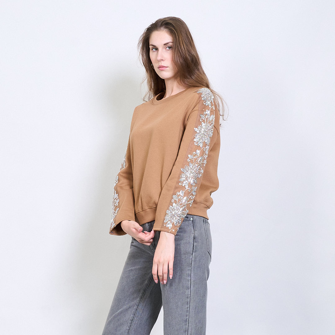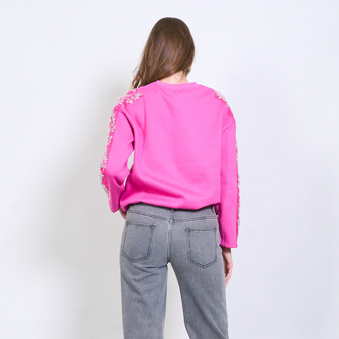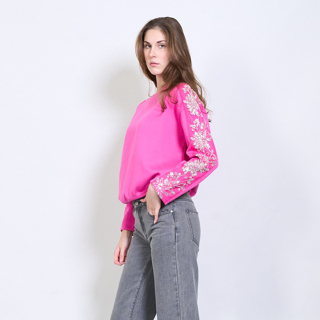 - Relaksēta veida džemperis ar ziedu fliteru izrotājumiem uz piedurknēm
