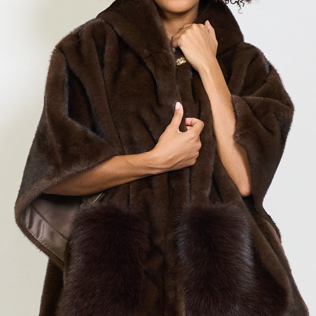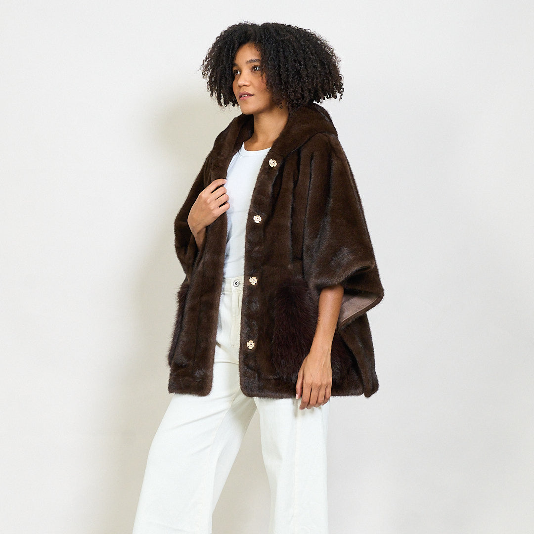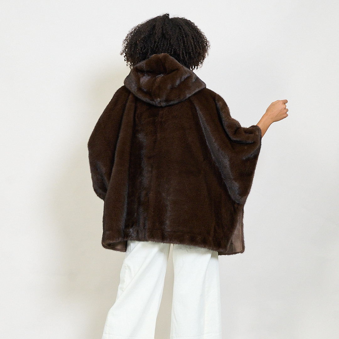Īsas mākslīgās kažokādas apmetnis ar kapuces dizaina vairumtirdzniecību