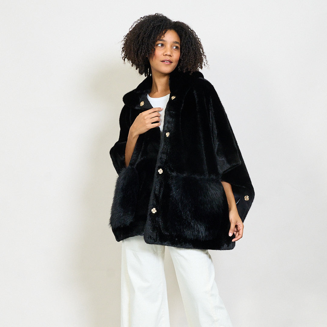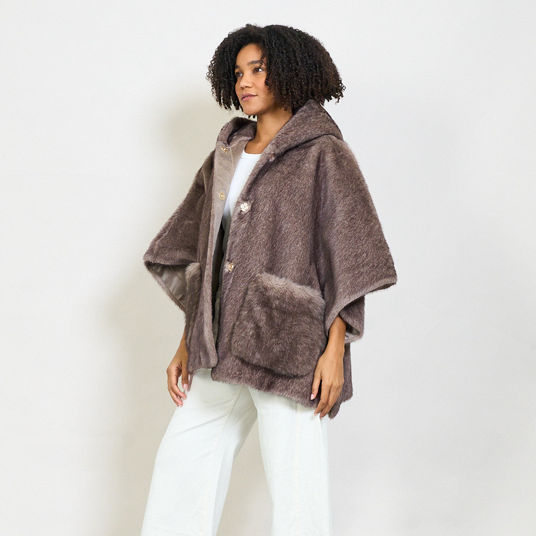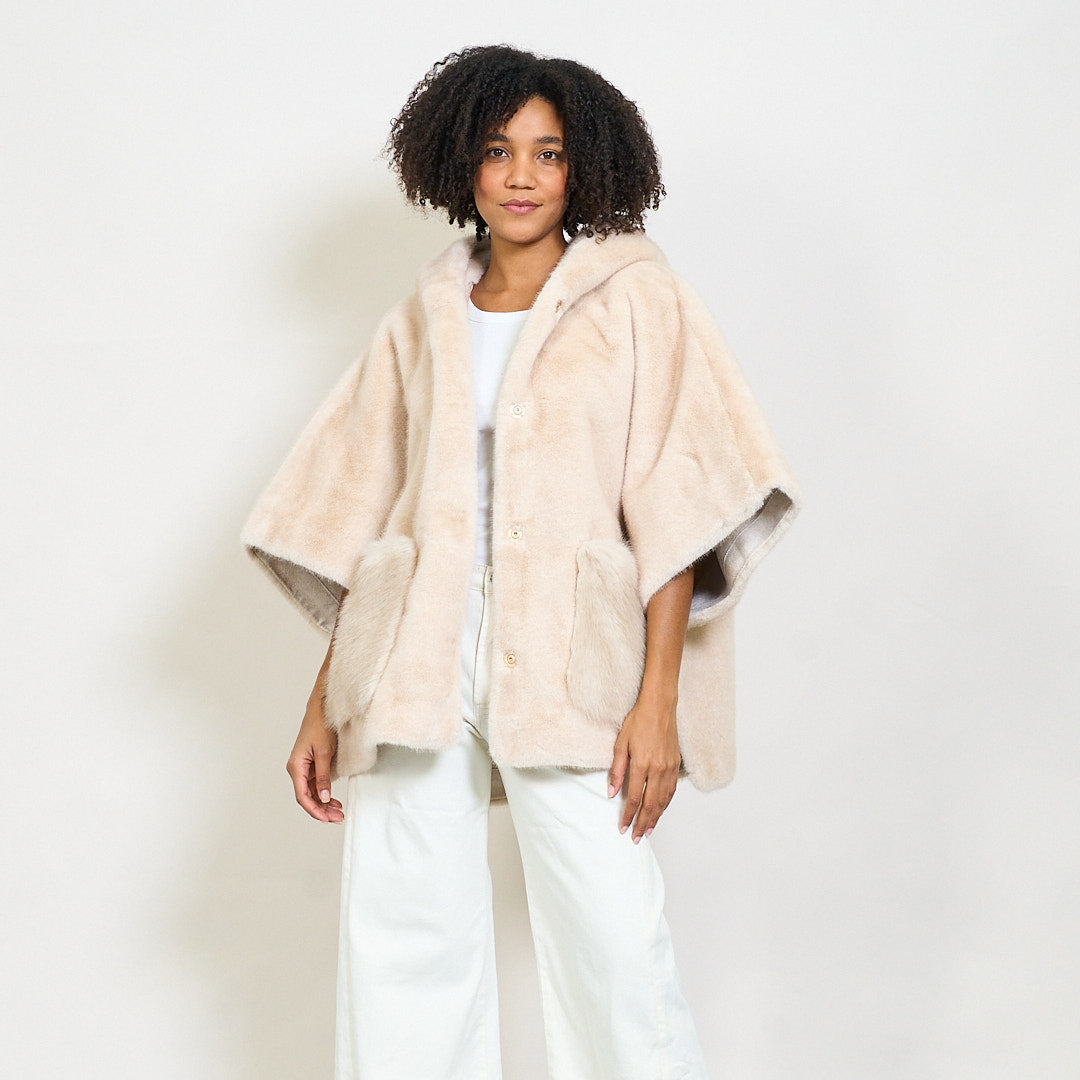 Īsas mākslīgās kažokādas apmetnis ar kapuces dizaina vairumtirdzniecību