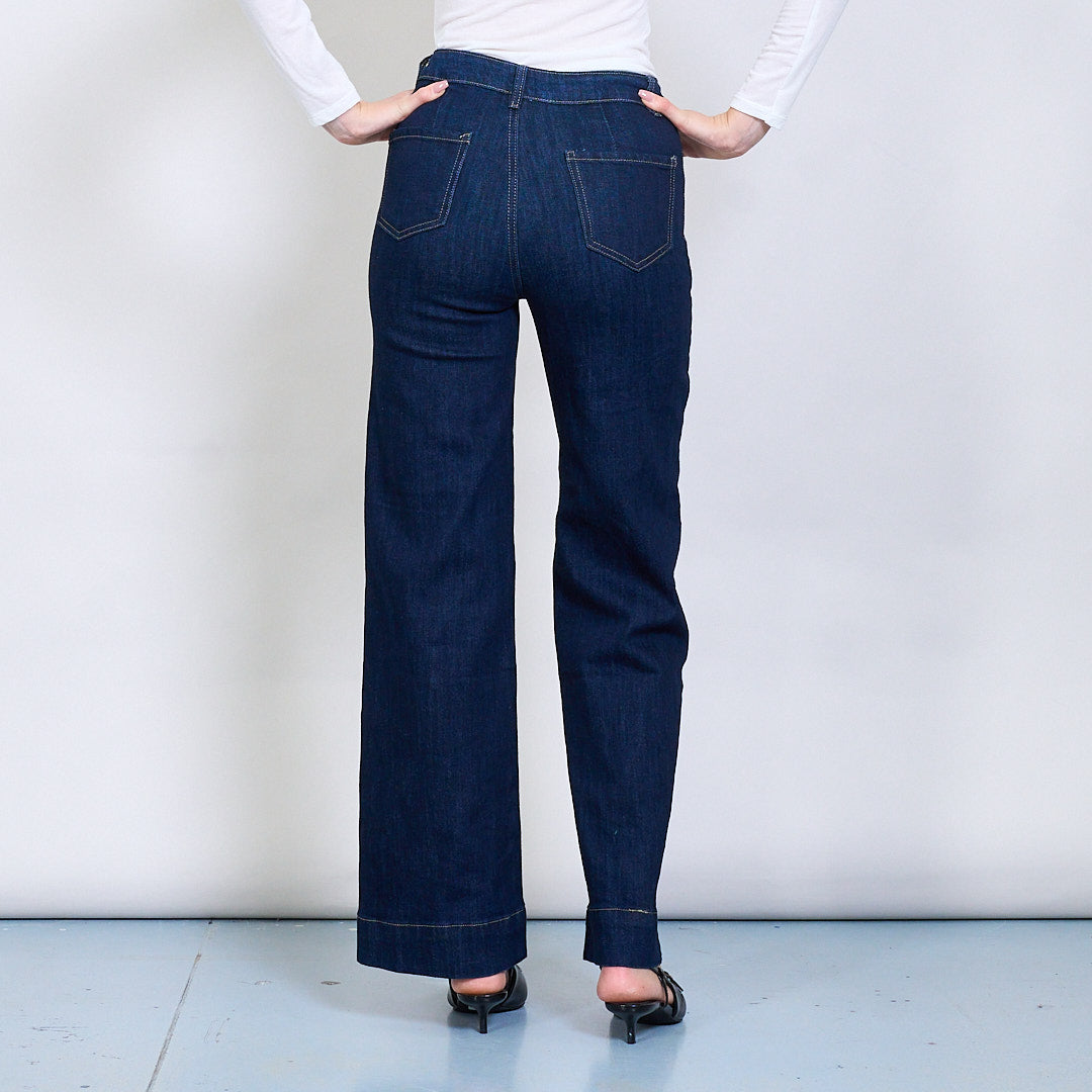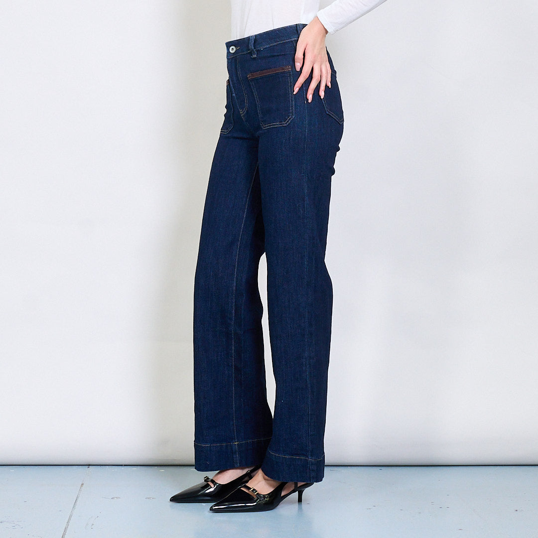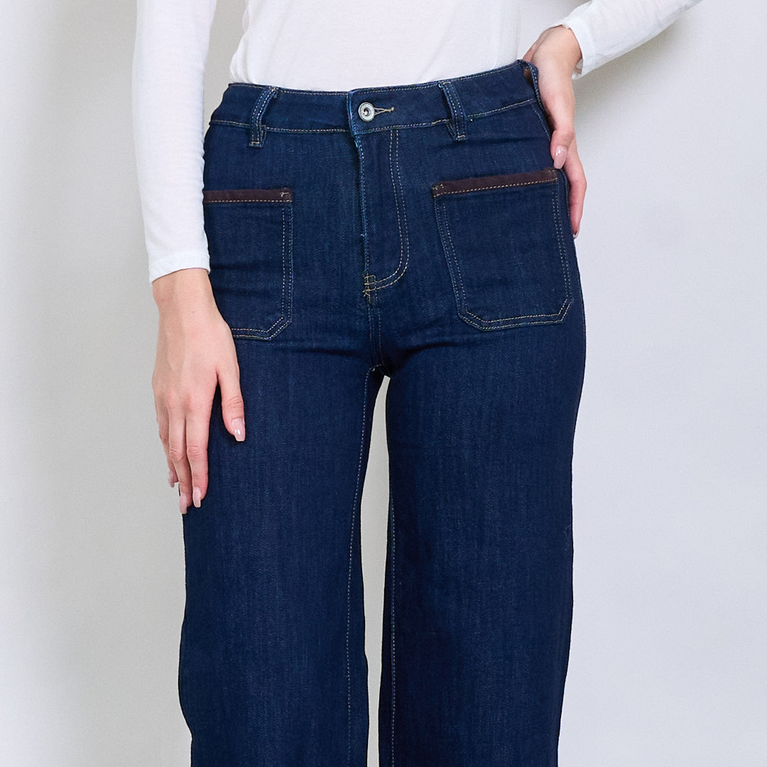 Taisni kājas džinsi ar kontrasta apdares plākstera kabatu vairumtirdzniecību