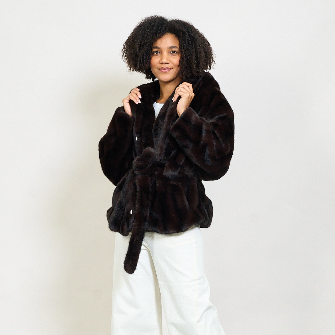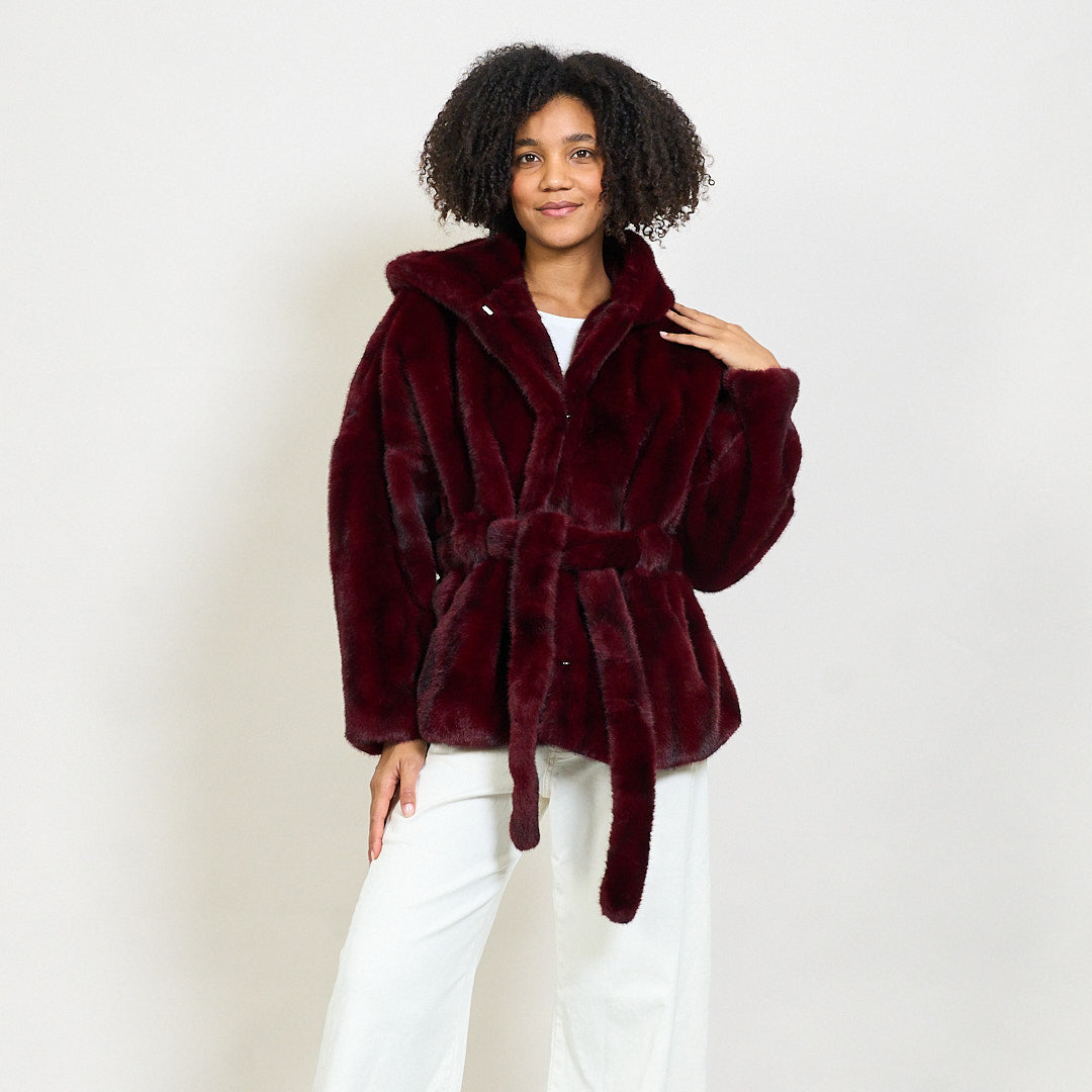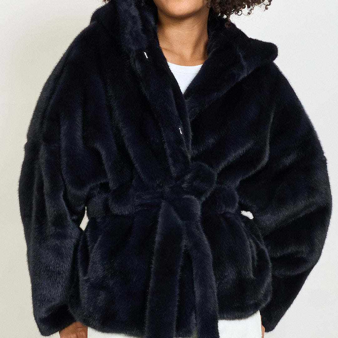 Teksturēta mākslīgā kažokāda ar platu apkakli un atbilstošu jostu vairumtirdzniecību