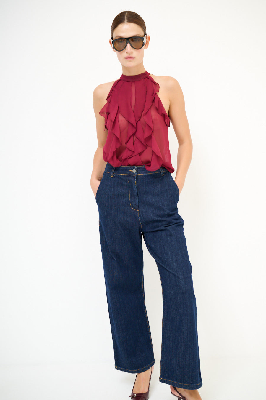 - Dziļa indigo mazgāšana ar kontrasta šuvi