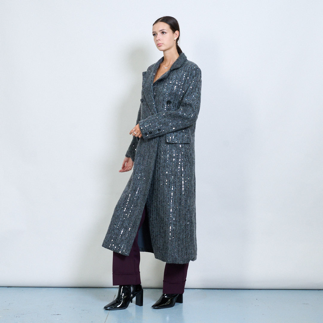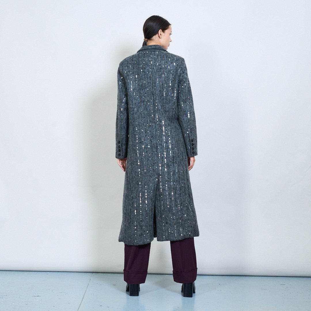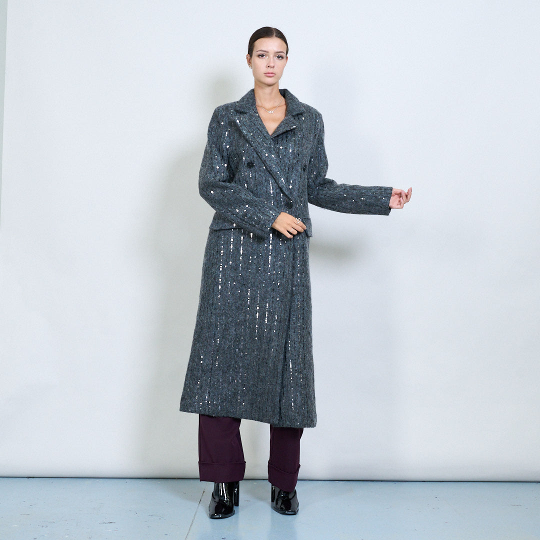 Longline Sequin svītrains dubultā krūtis mētelis Vairumtirdzniecība