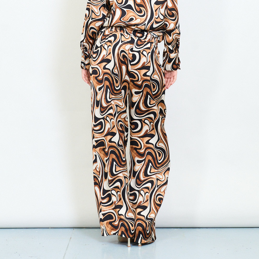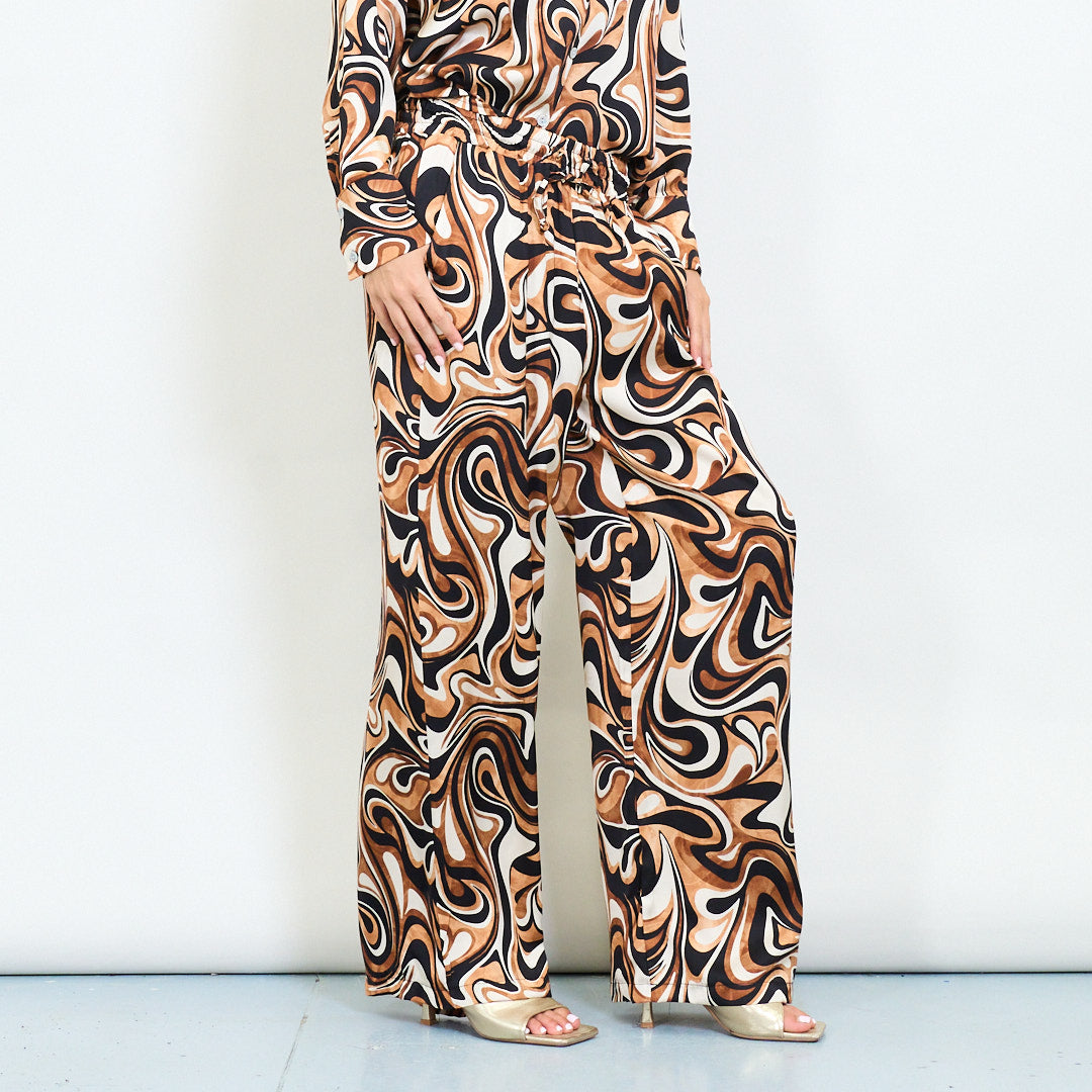 - Plata kājas bikses, kurās ir trekns retro virpuļa raksts