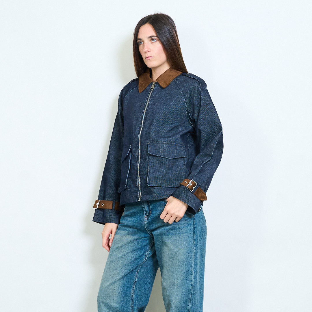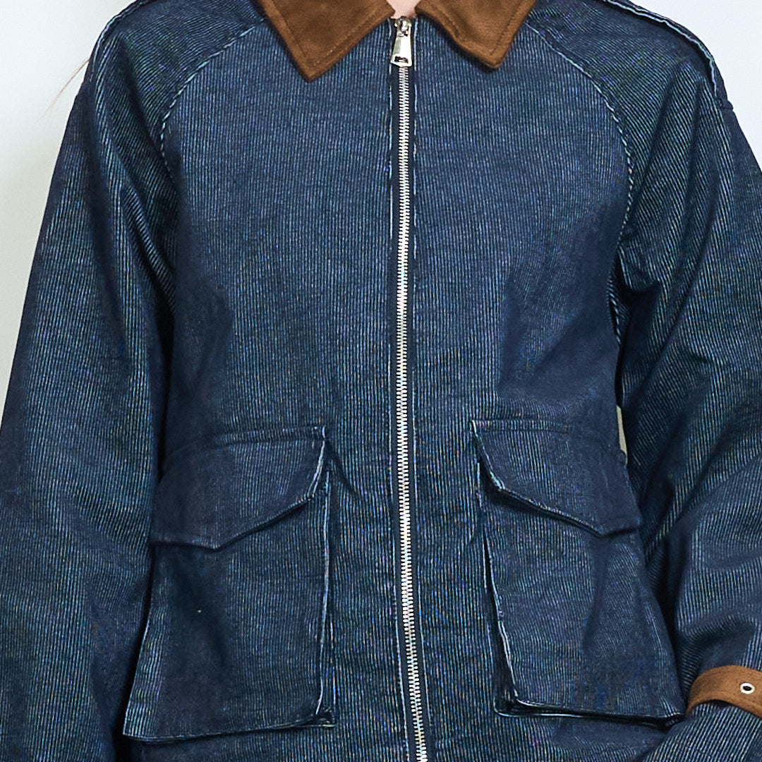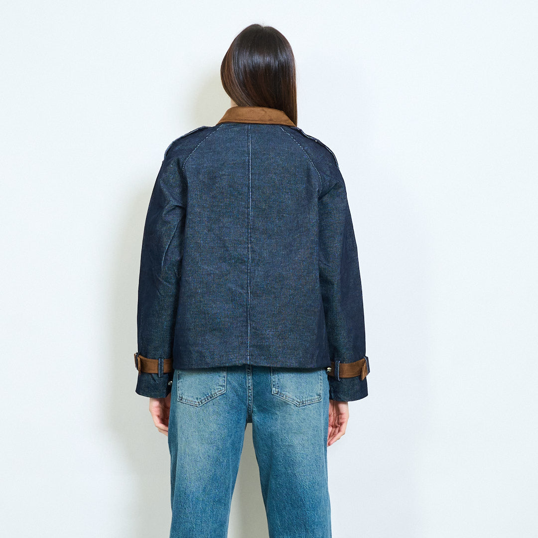 Kontrasta apkakles un aproces lietderības džinsa jaka Vairumtirdzniecība