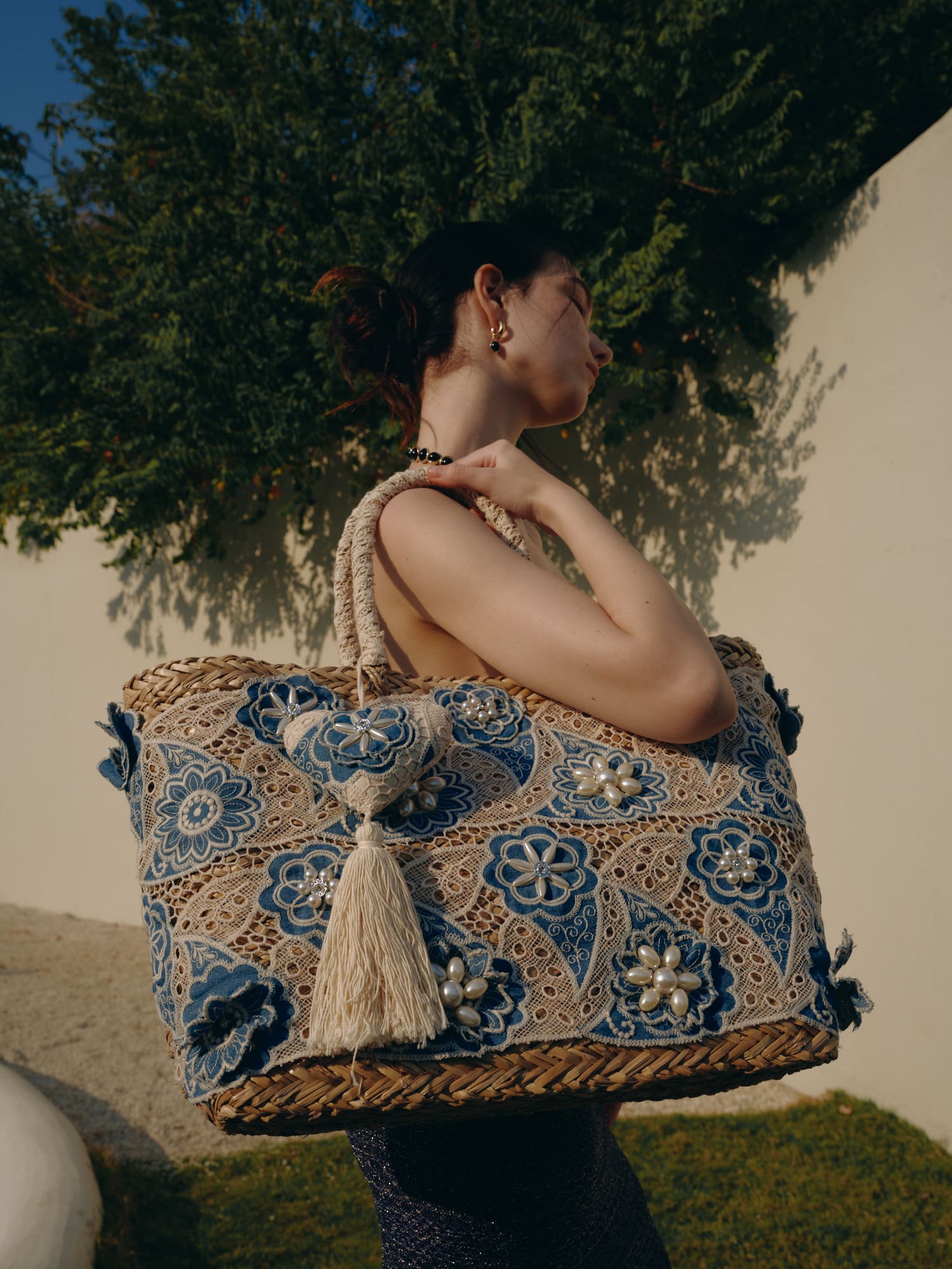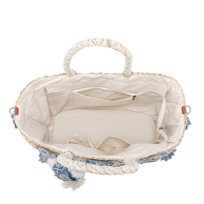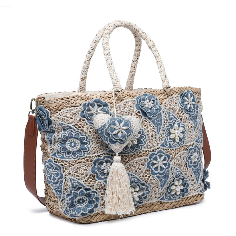 Rokas austi salmu soma ar džinsa ziedu mežģīnēm un Pearl Heart Charm Wholesale