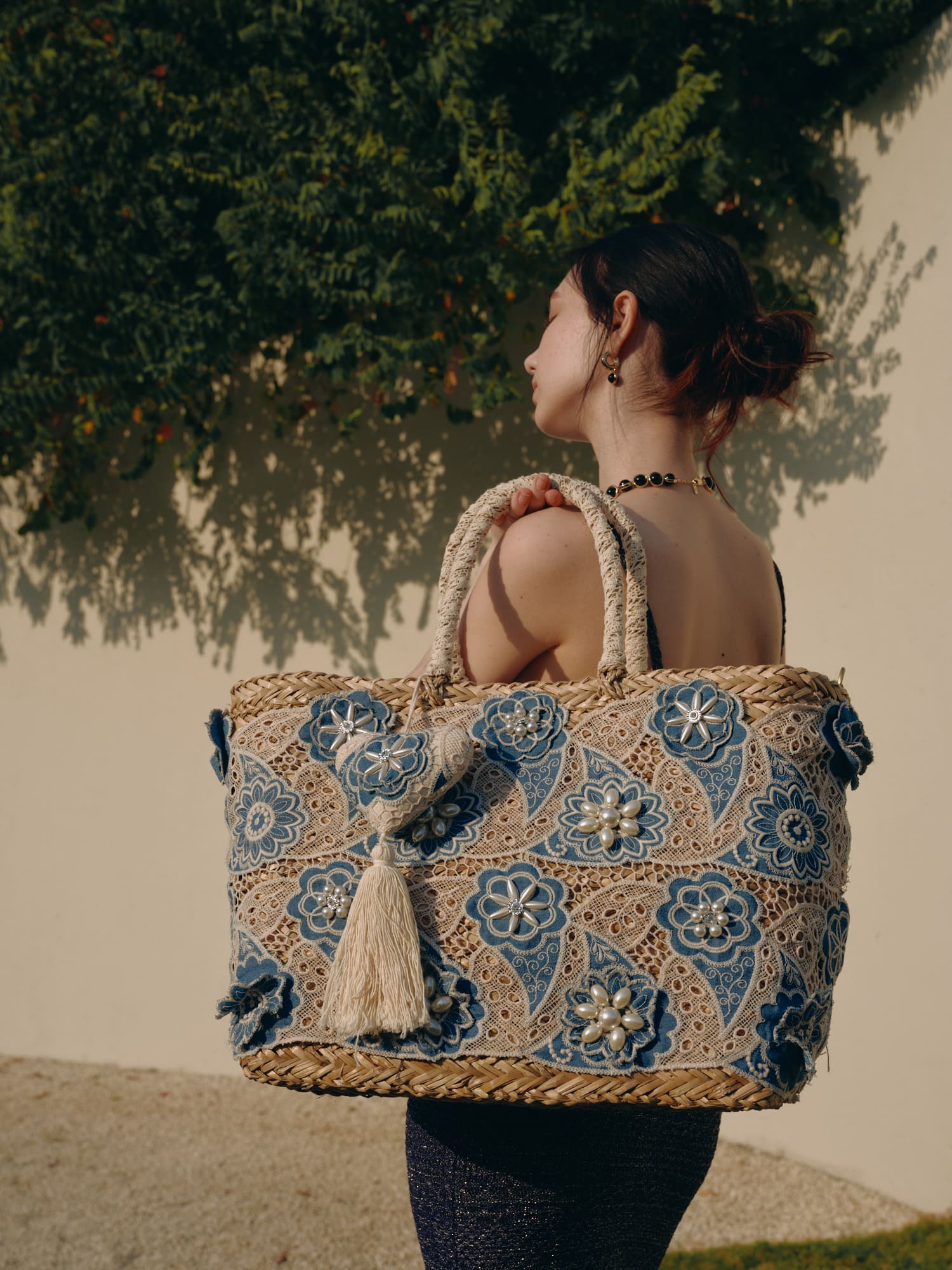 - Izrotāts ar džinsa efektiem ziedu mežģīnēm un pērļu detaļām