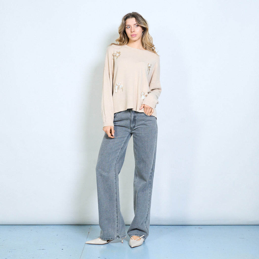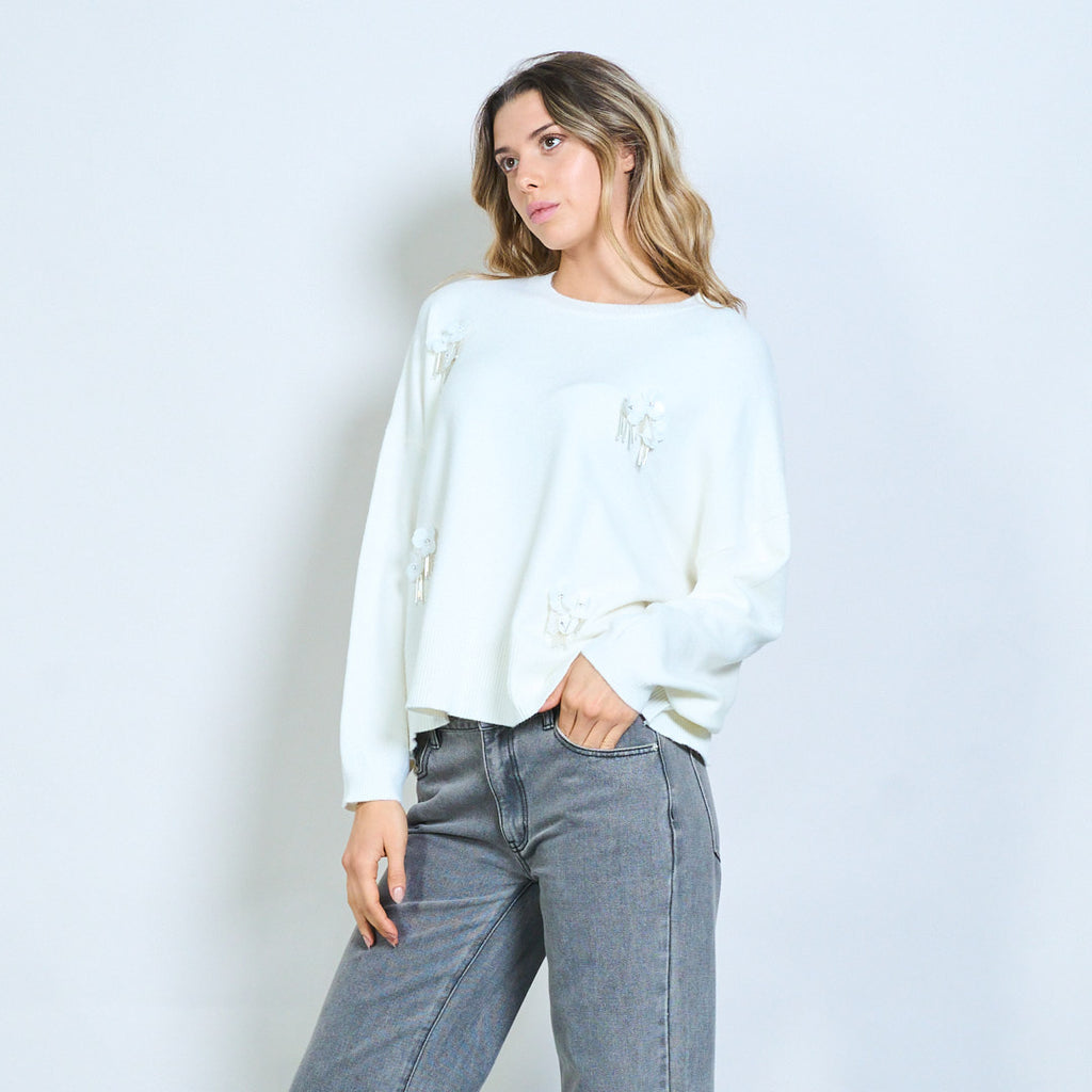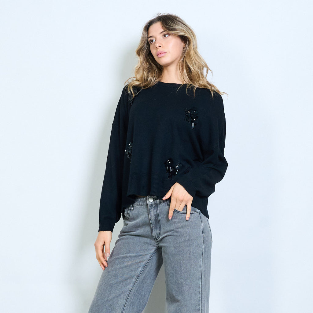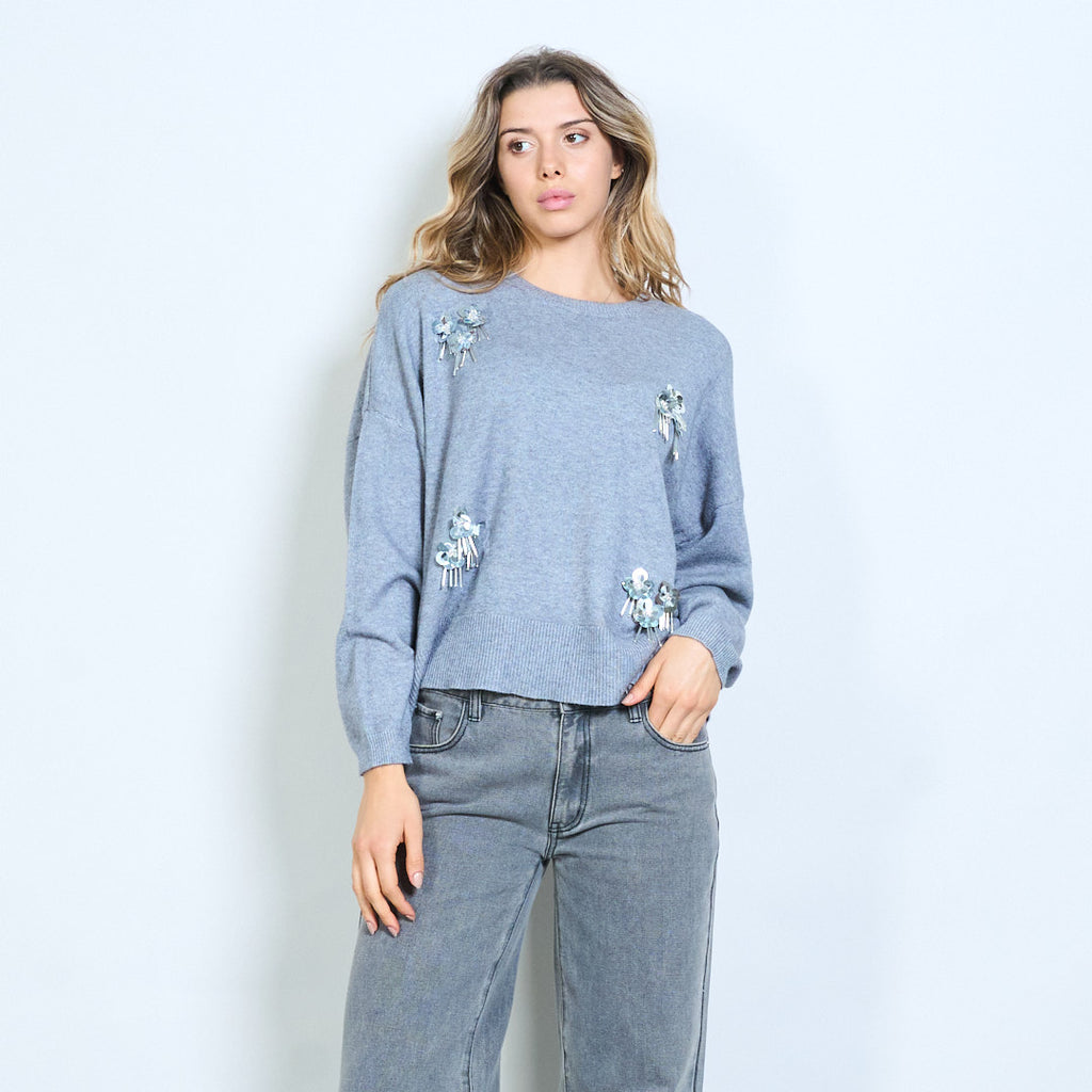 Fērzēts ziedu izrotājuma apkalpes kakla adīts džemperis Vairumtirdzniecība