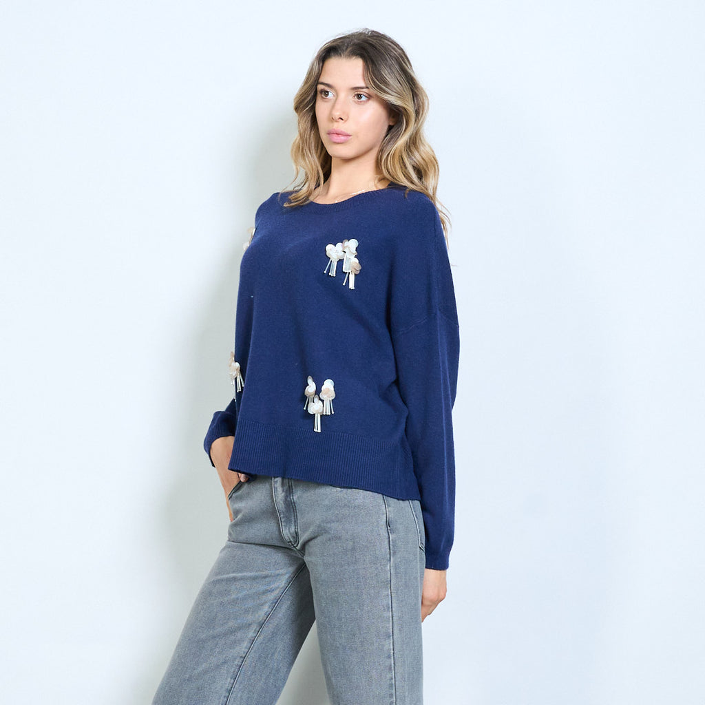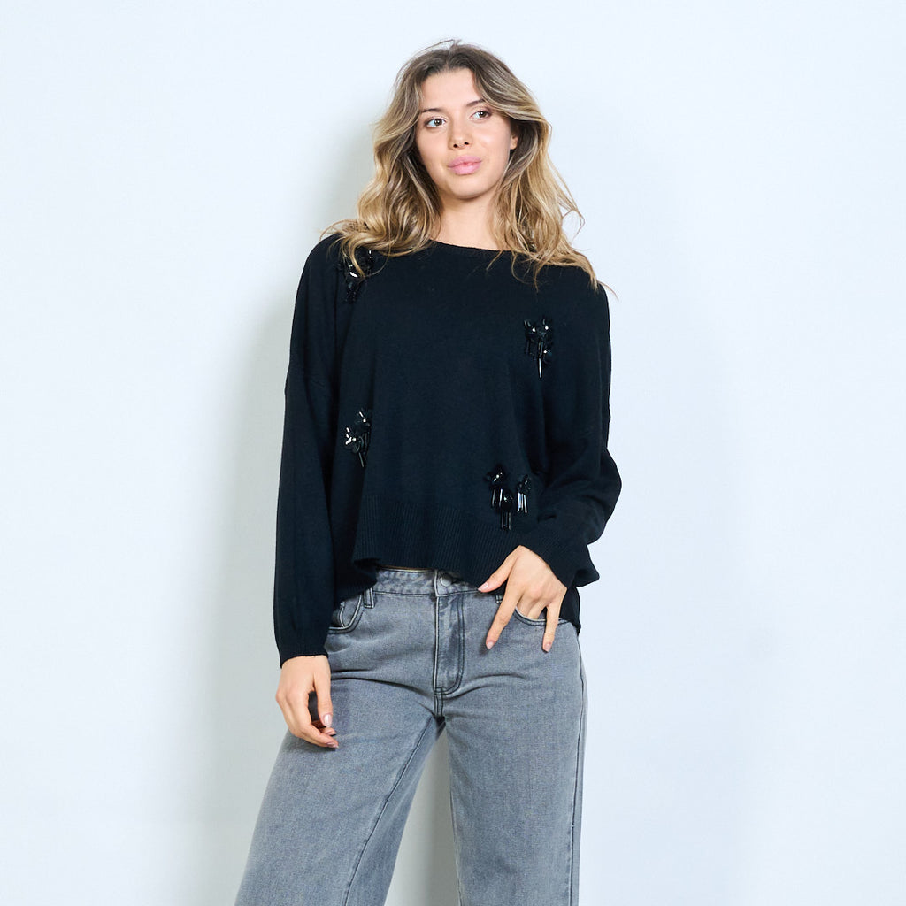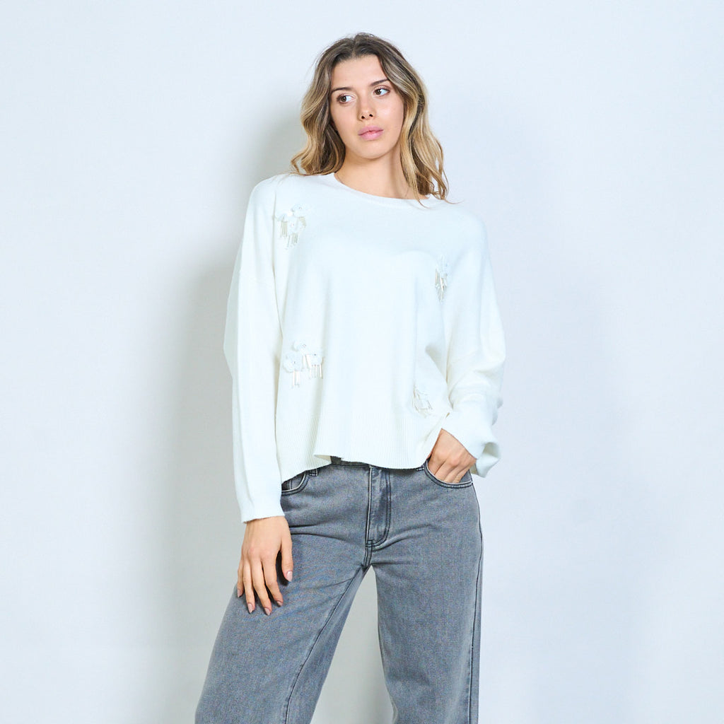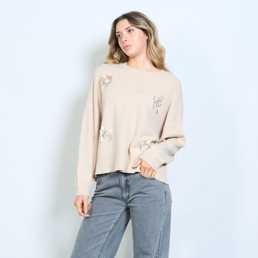 Fērzēts ziedu izrotājuma apkalpes kakla adīts džemperis Vairumtirdzniecība