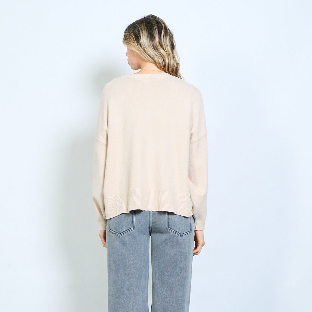- Apkalpes kakla džemperis, kas sīki aprakstīts ar elegantiem fāzēm ziedu izrotājumiem