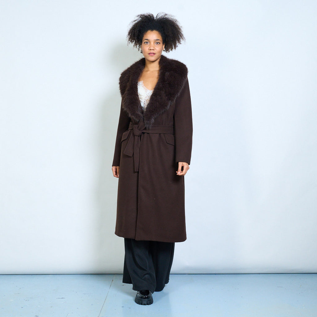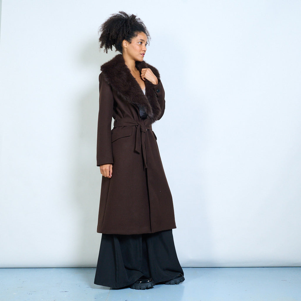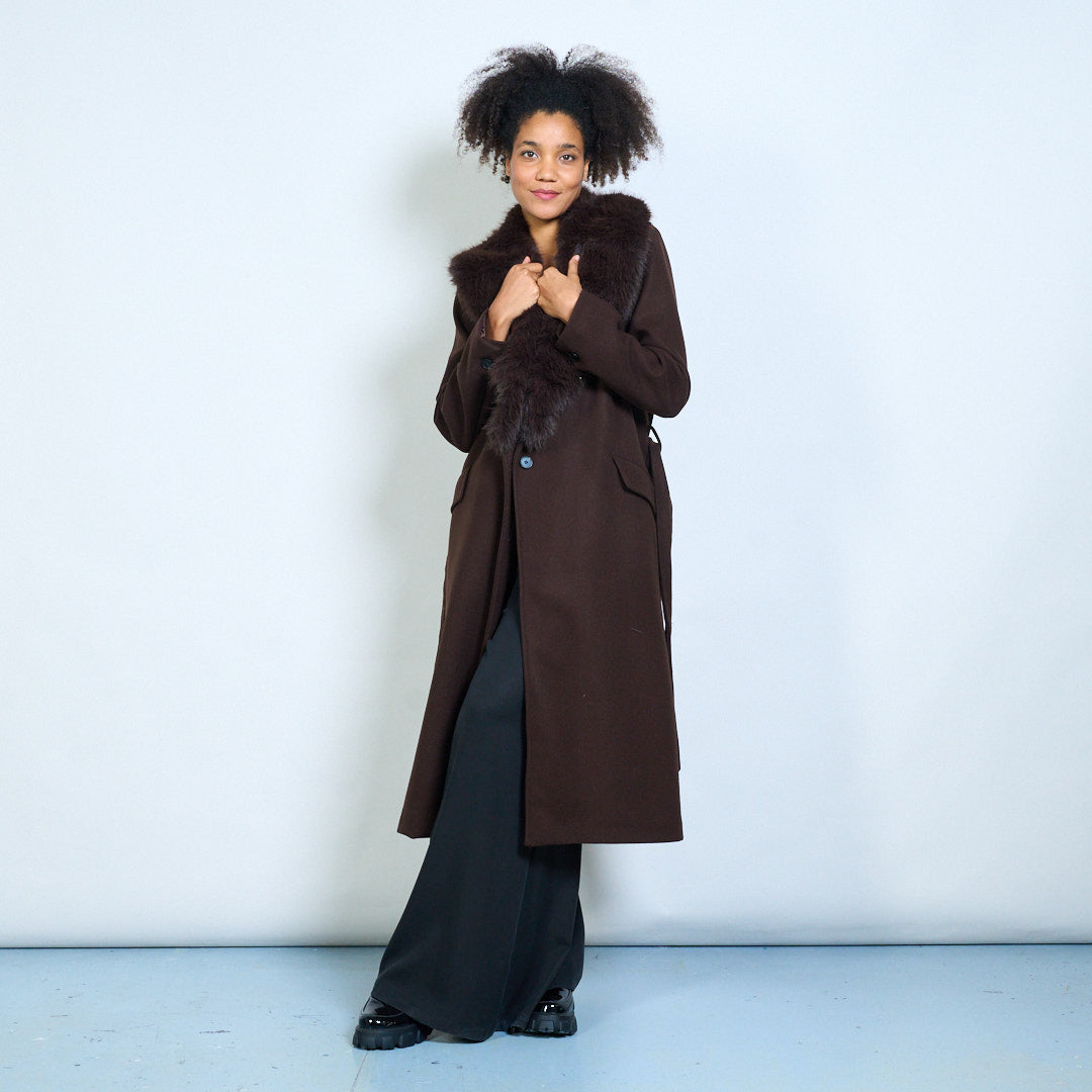 Mākslīgās kažokādas apkakles divrindu garais mētelis vairumtirdzniecība