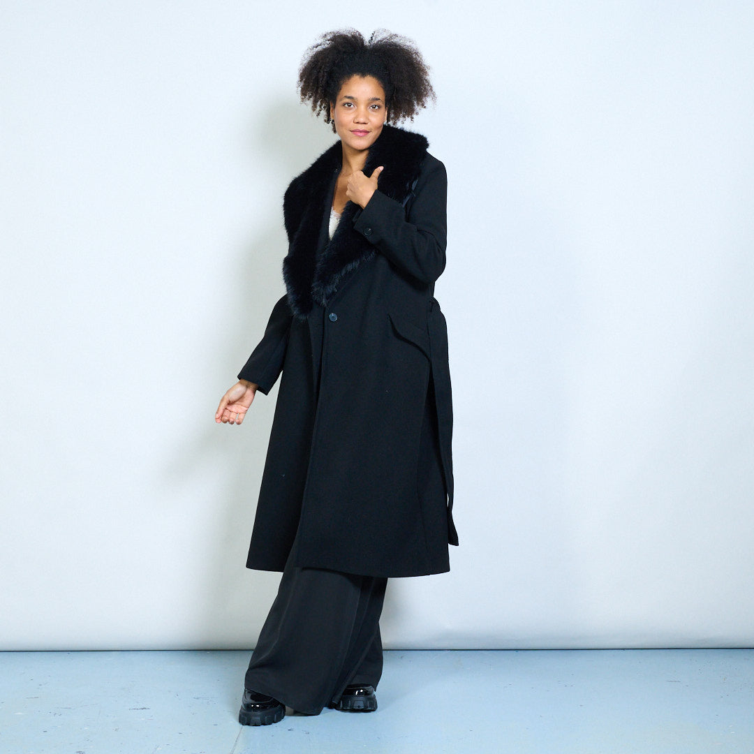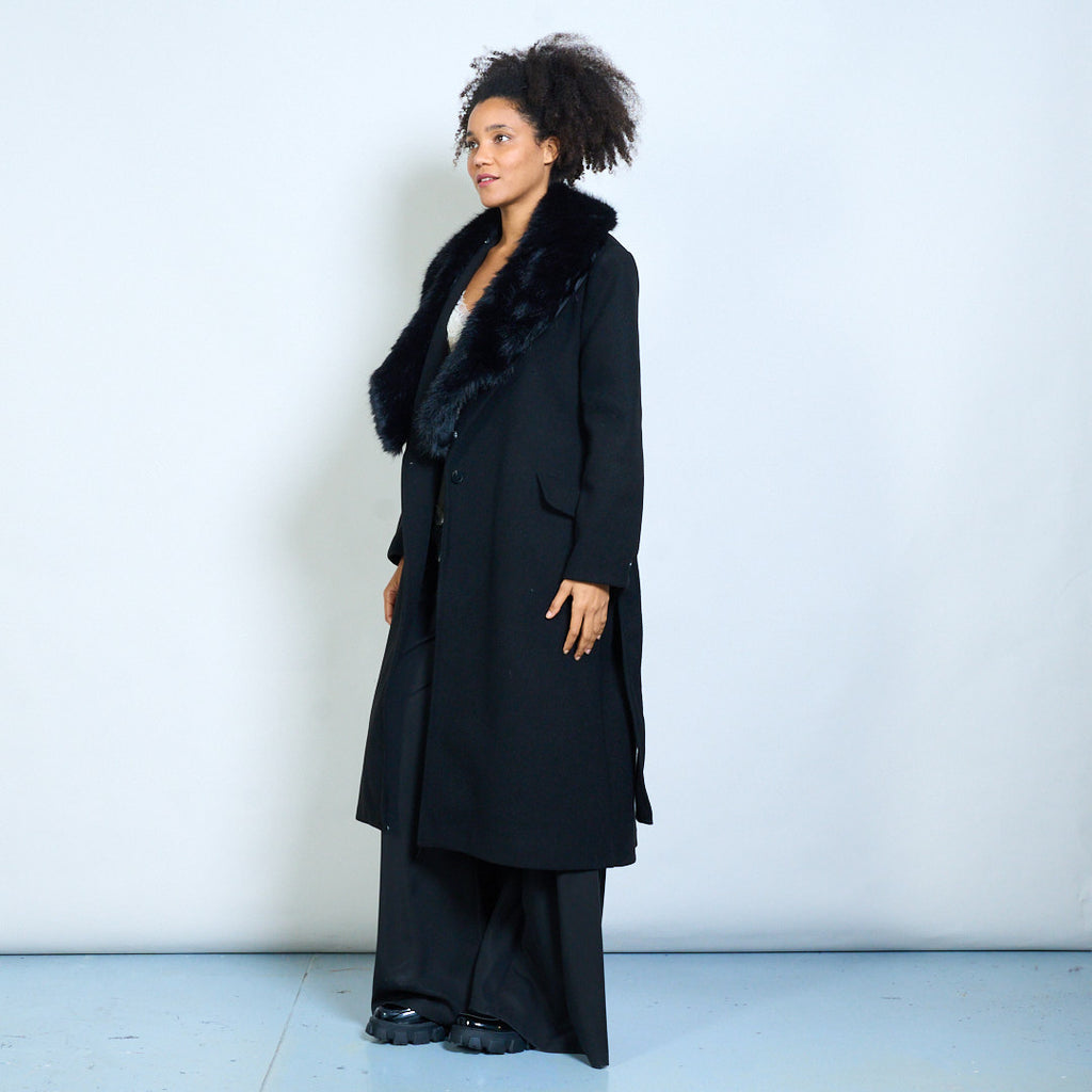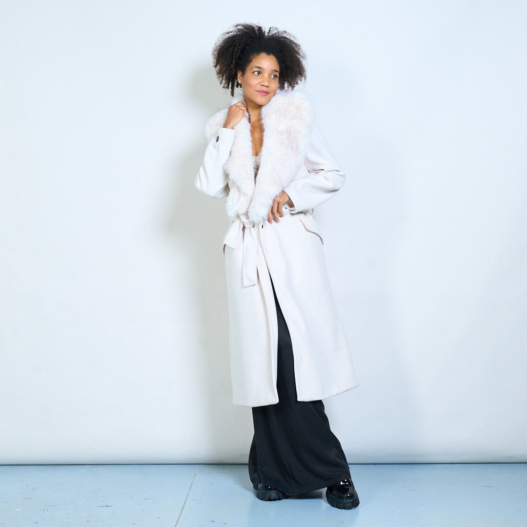 Mākslīgās kažokādas apkakles divrindu garais mētelis vairumtirdzniecība