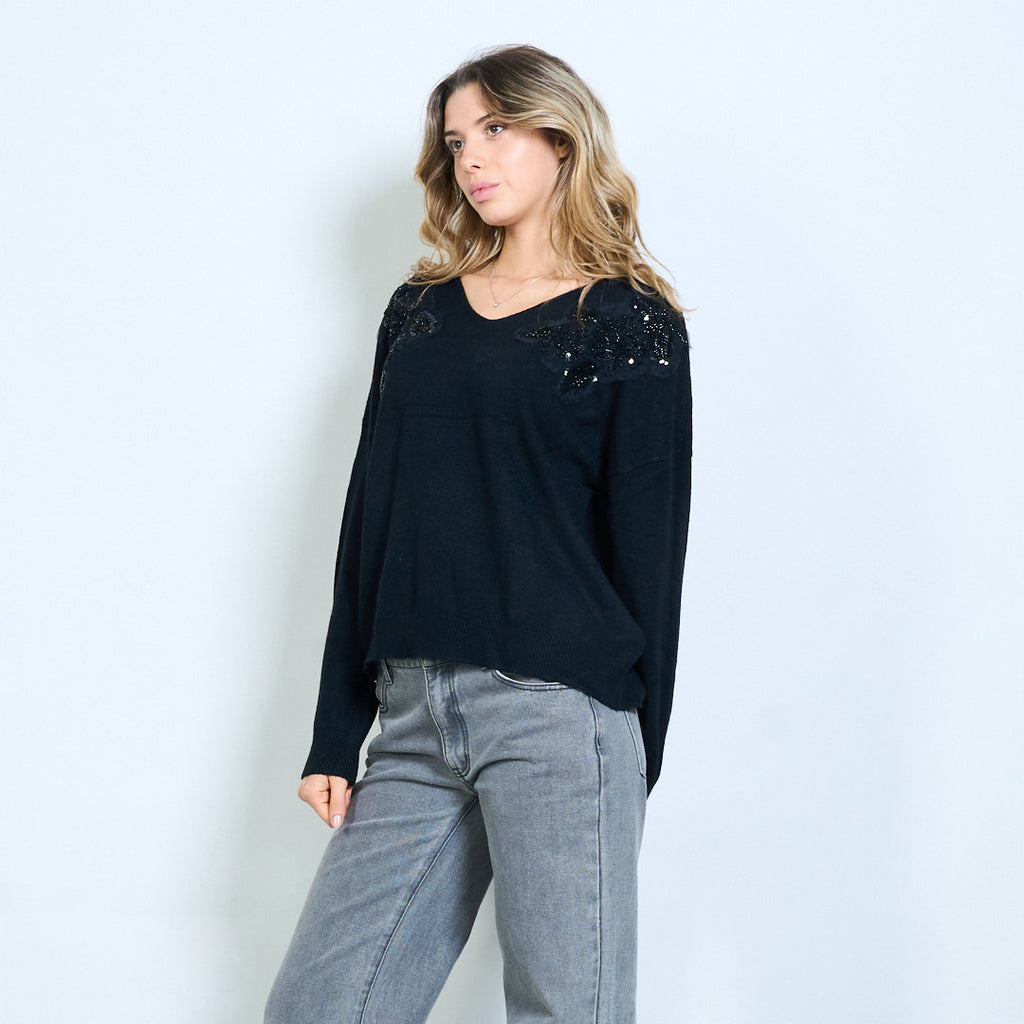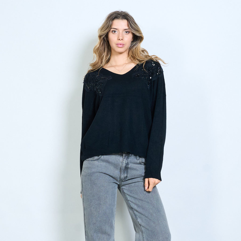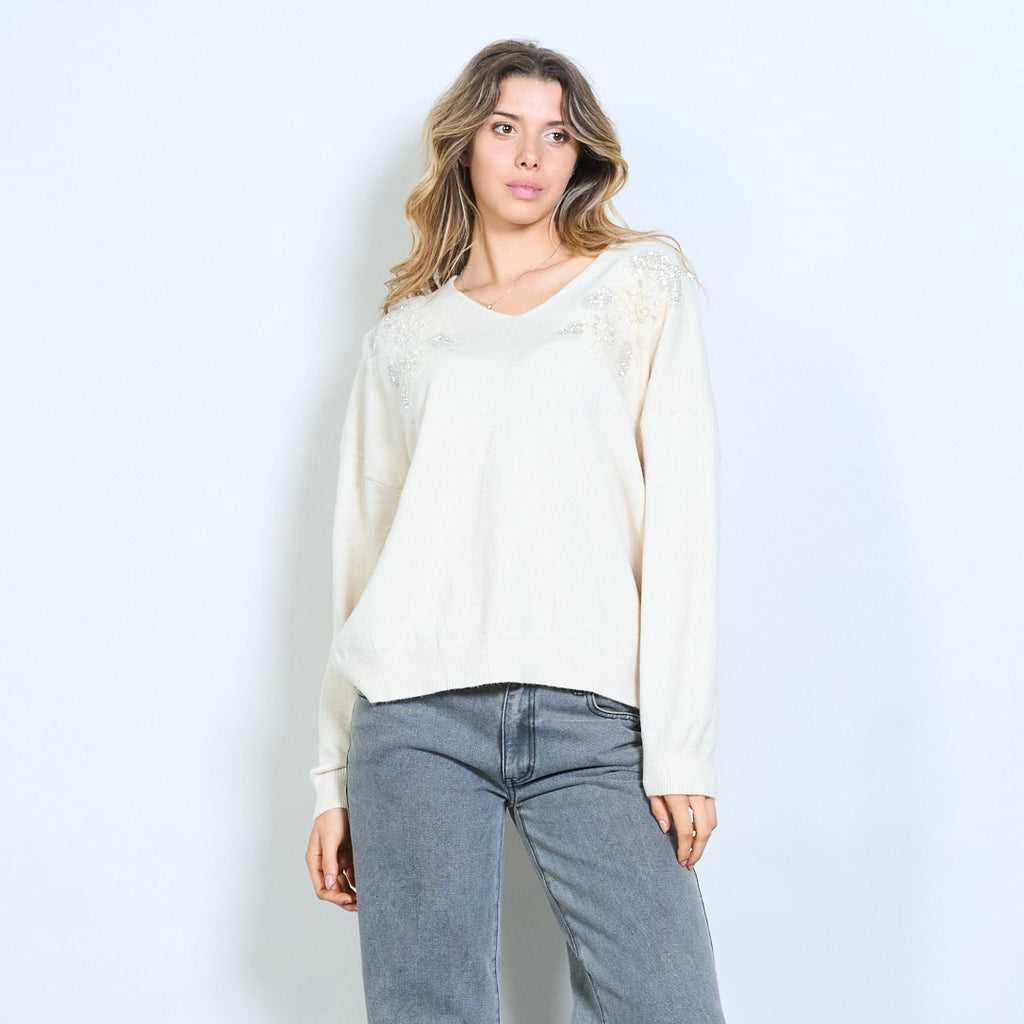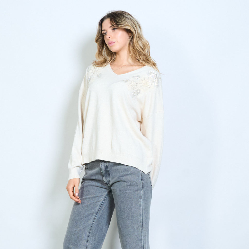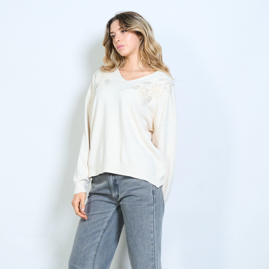 - V kakla džemperis, kas veidots ar elegantām ziedu lodītēm un fliteru izrotājumiem