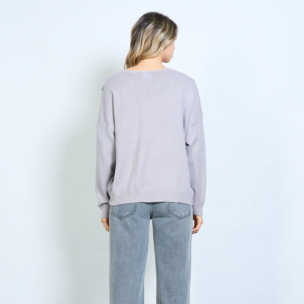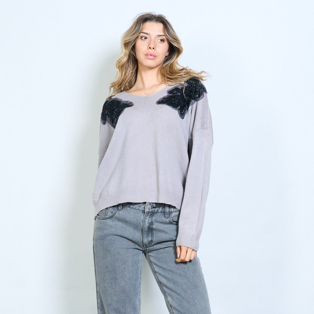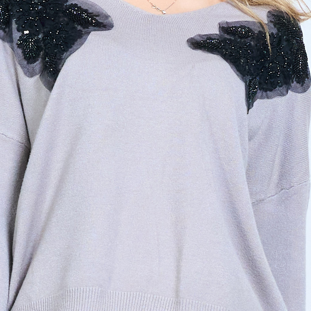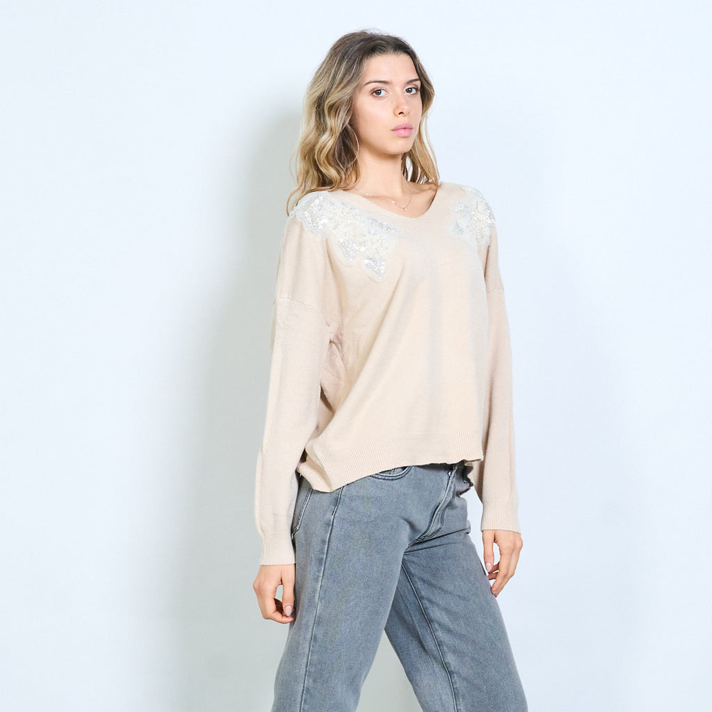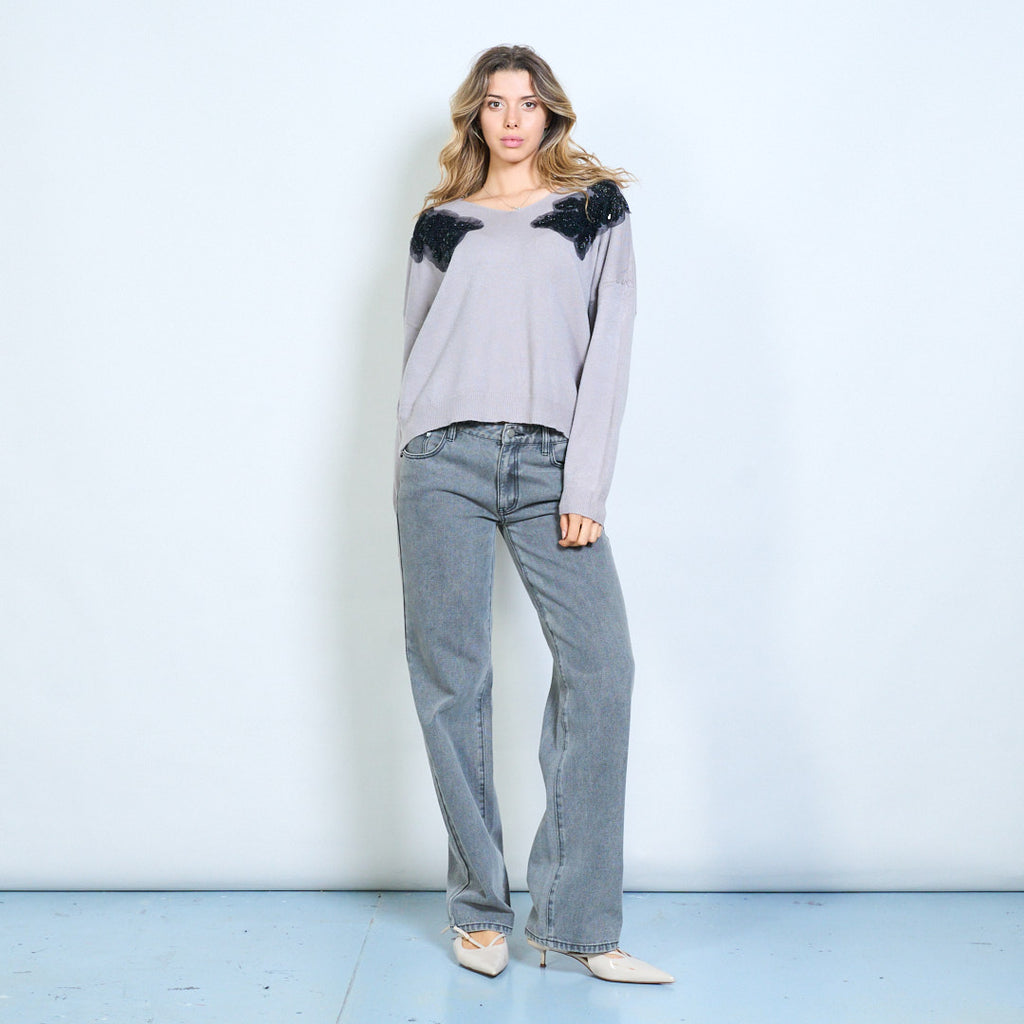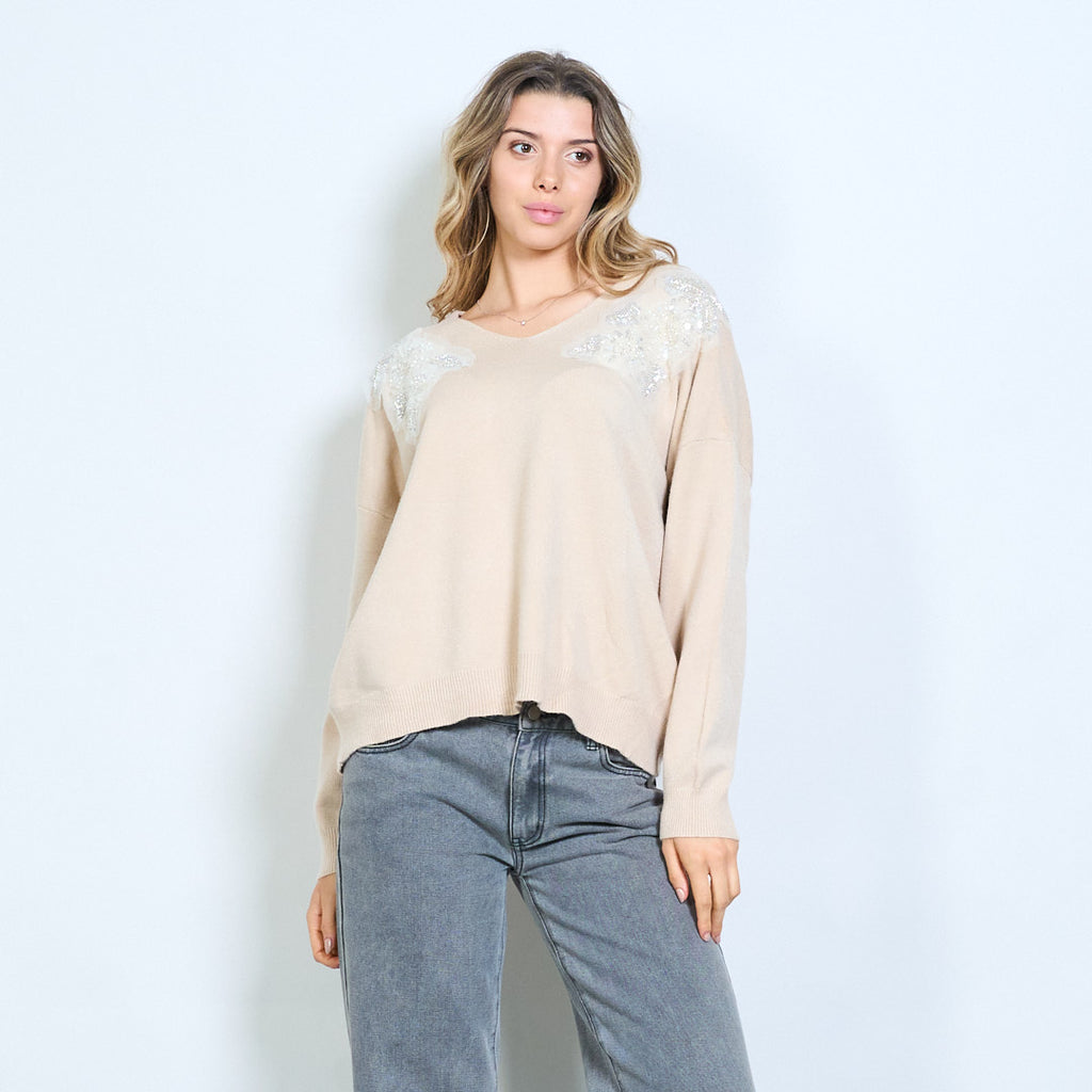 - V kakla džemperis, kas veidots ar elegantām ziedu lodītēm un fliteru izrotājumiem