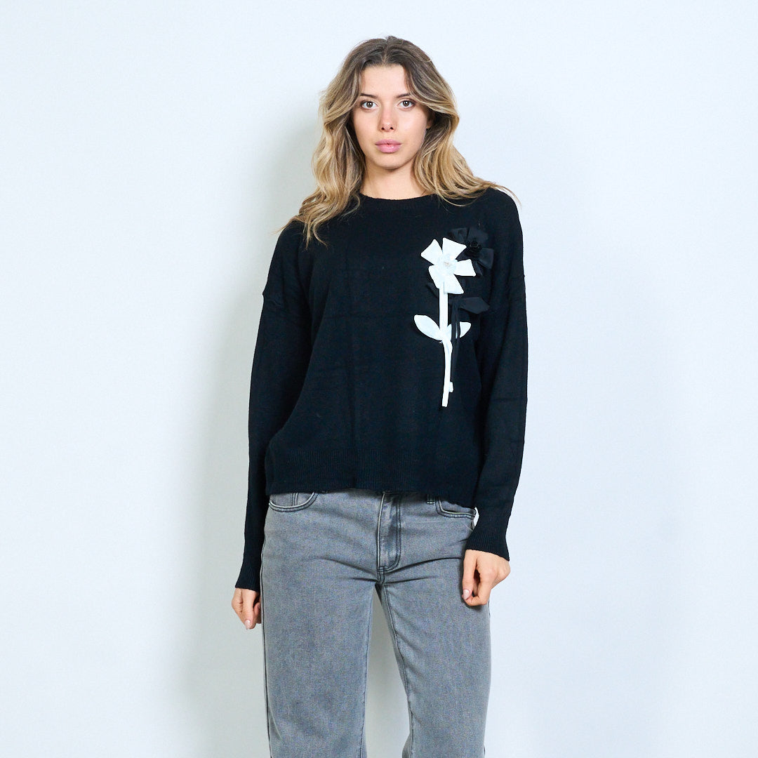- Apkalpes kakla džemperis, kas akcentēts ar lielizmēra priekšgala aplikācijām kontrastējošos toņos