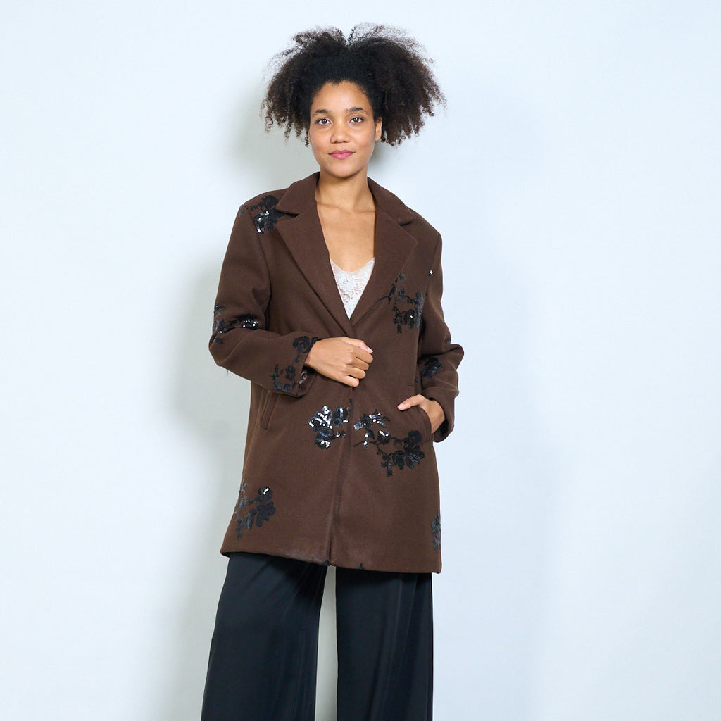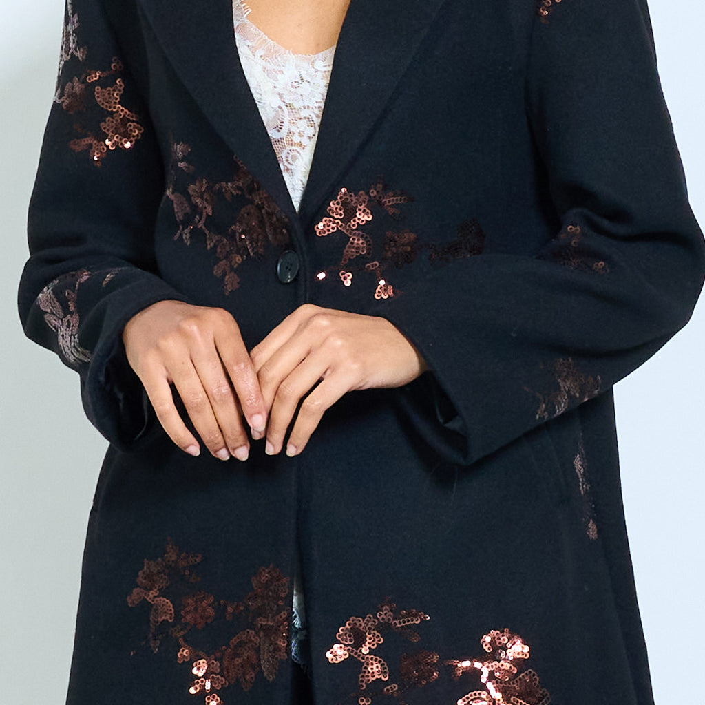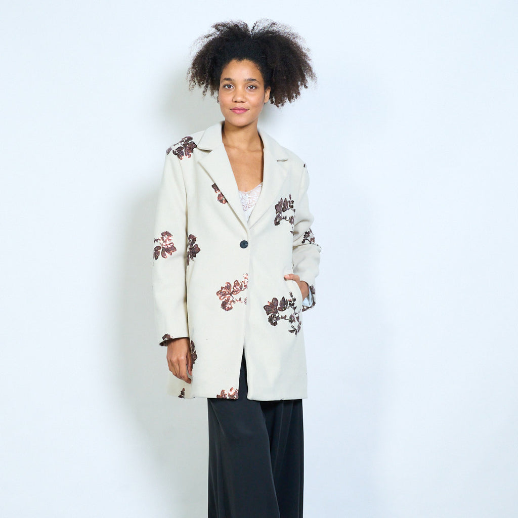 Ziedu fliteriem izrotāts āķu jedu mētelis vairumtirdzniecība
