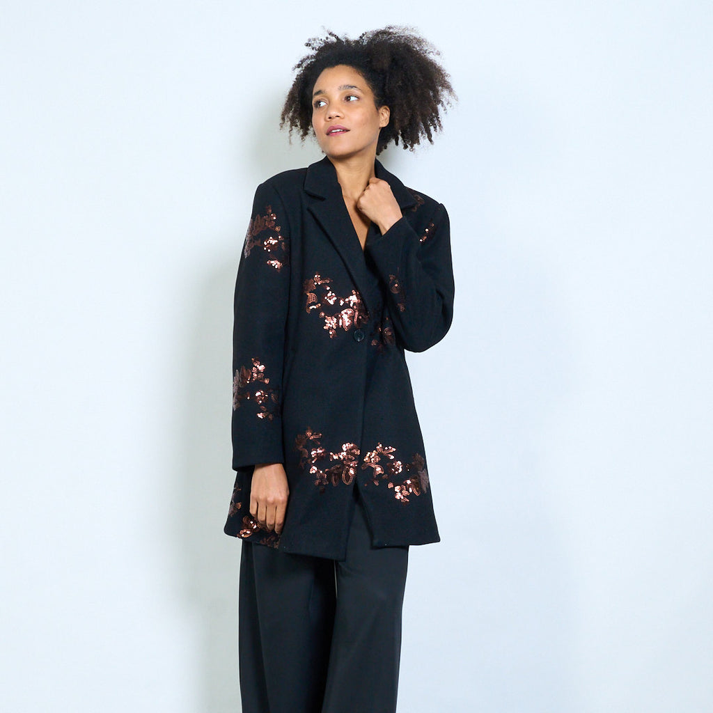• Elegants mētelis ar āķu jedām, kas izstrādāts ar klasisku atloka apkakli mūžīgai pievilcībai