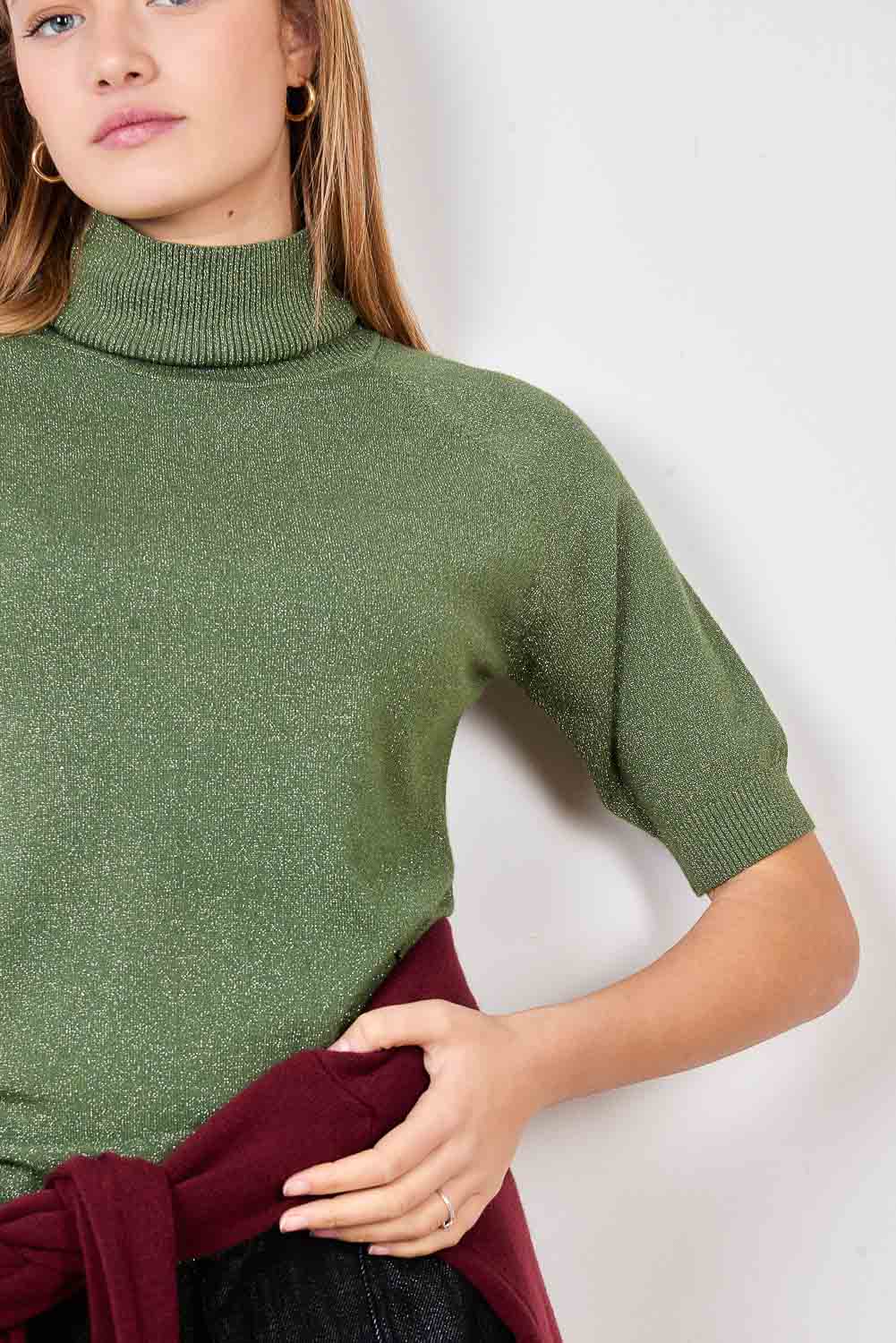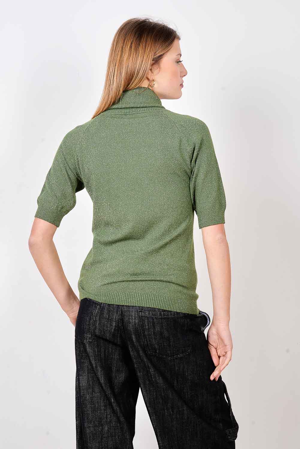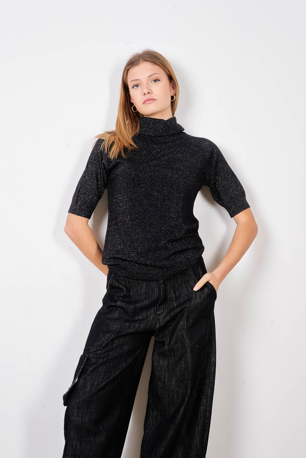 - Pieguļošs trikotāžas džemperis ar vertikālu mikro kniedes rotājumu priekšpusē