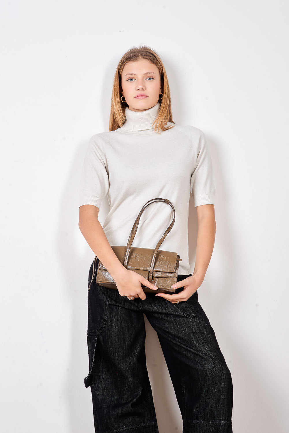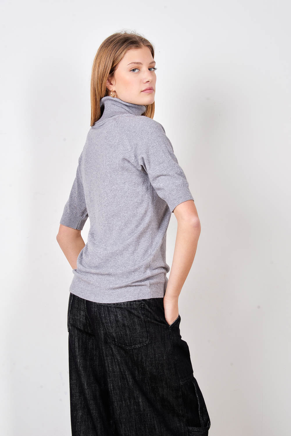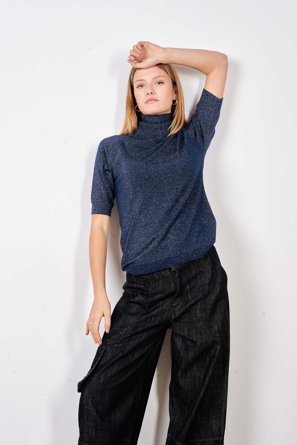 - Pieguļošs trikotāžas džemperis ar vertikālu mikro kniedes rotājumu priekšpusē