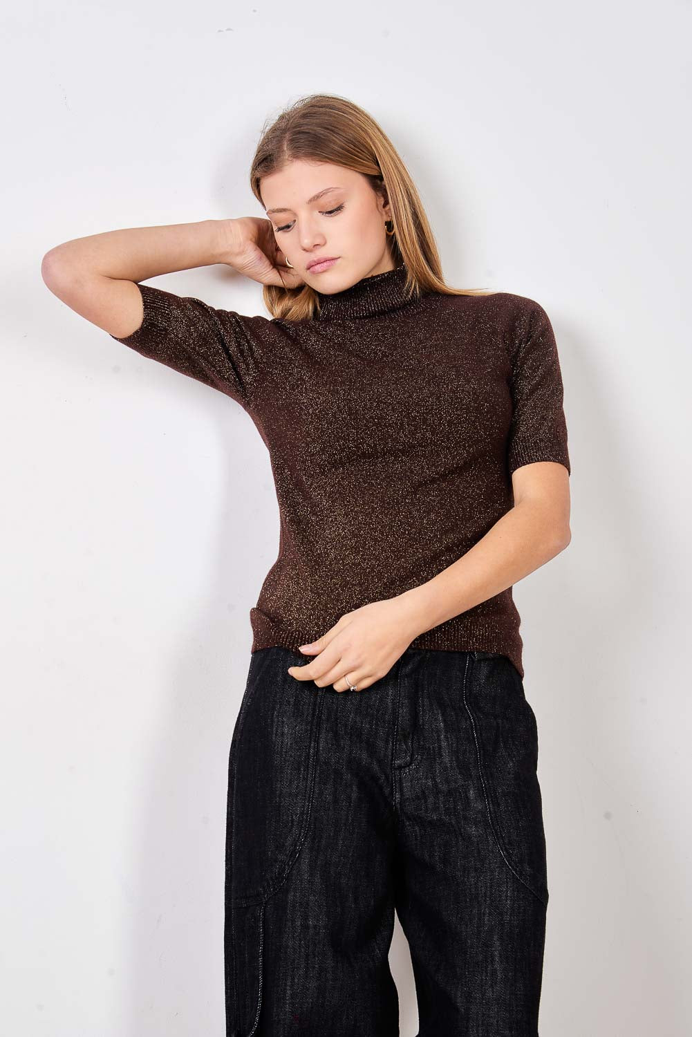 Smalks mirdzošs trikotāžas tops ar īsām piedurknēm vairumtirdzniecība