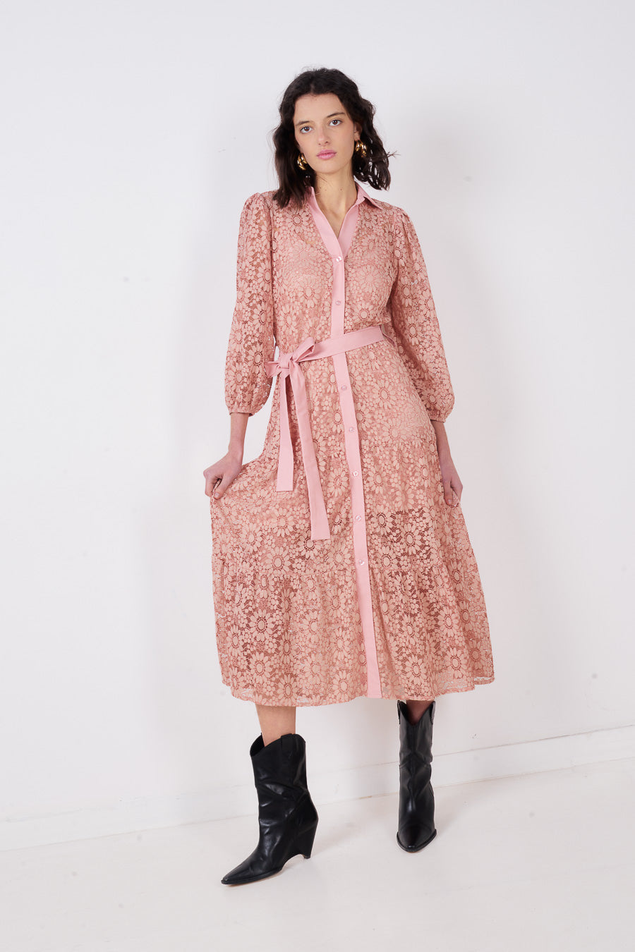 Mežģīņu pogas priekšējā jostasvietas kaklasaite ar garām piedurknēm midi kleitu vairumtirdzniecība