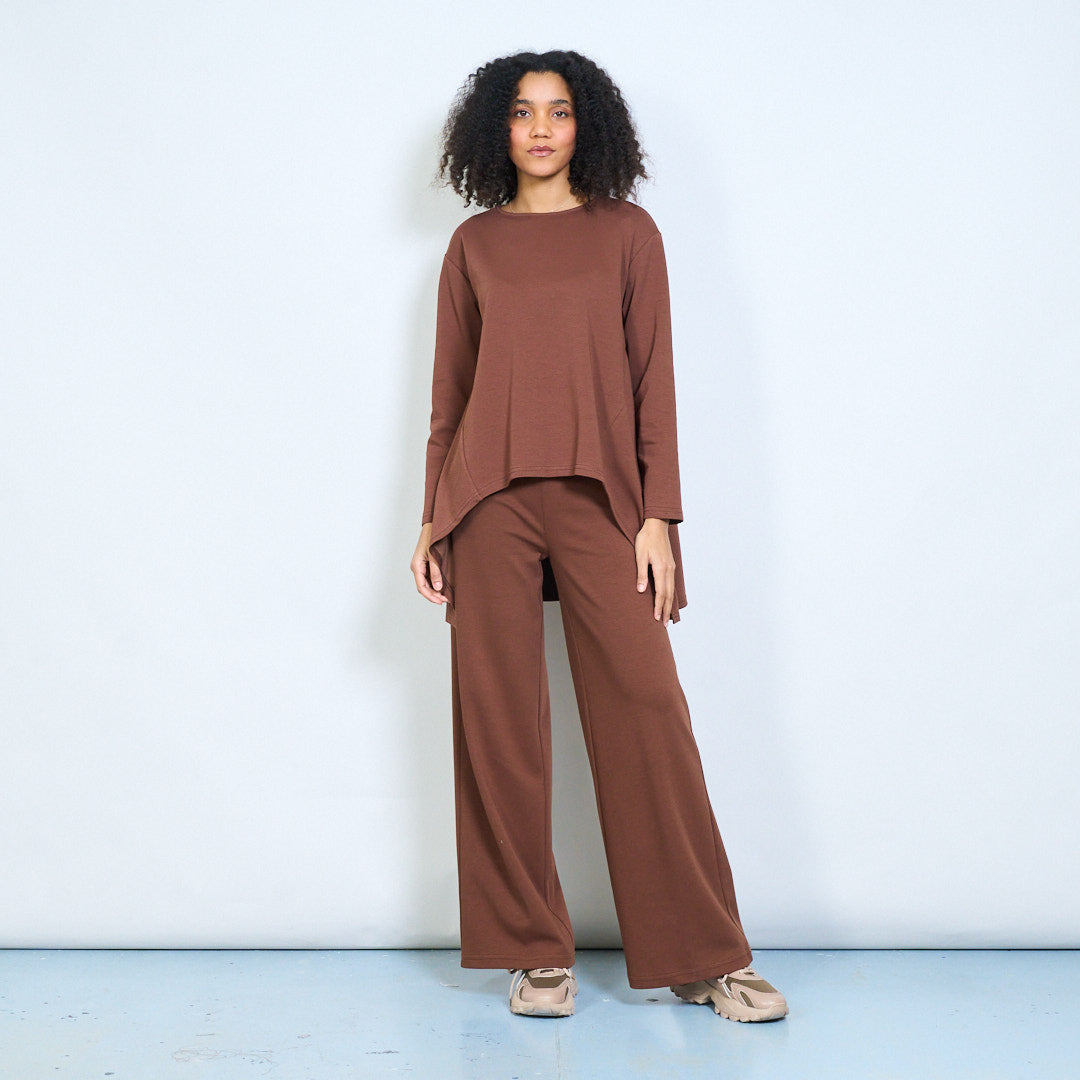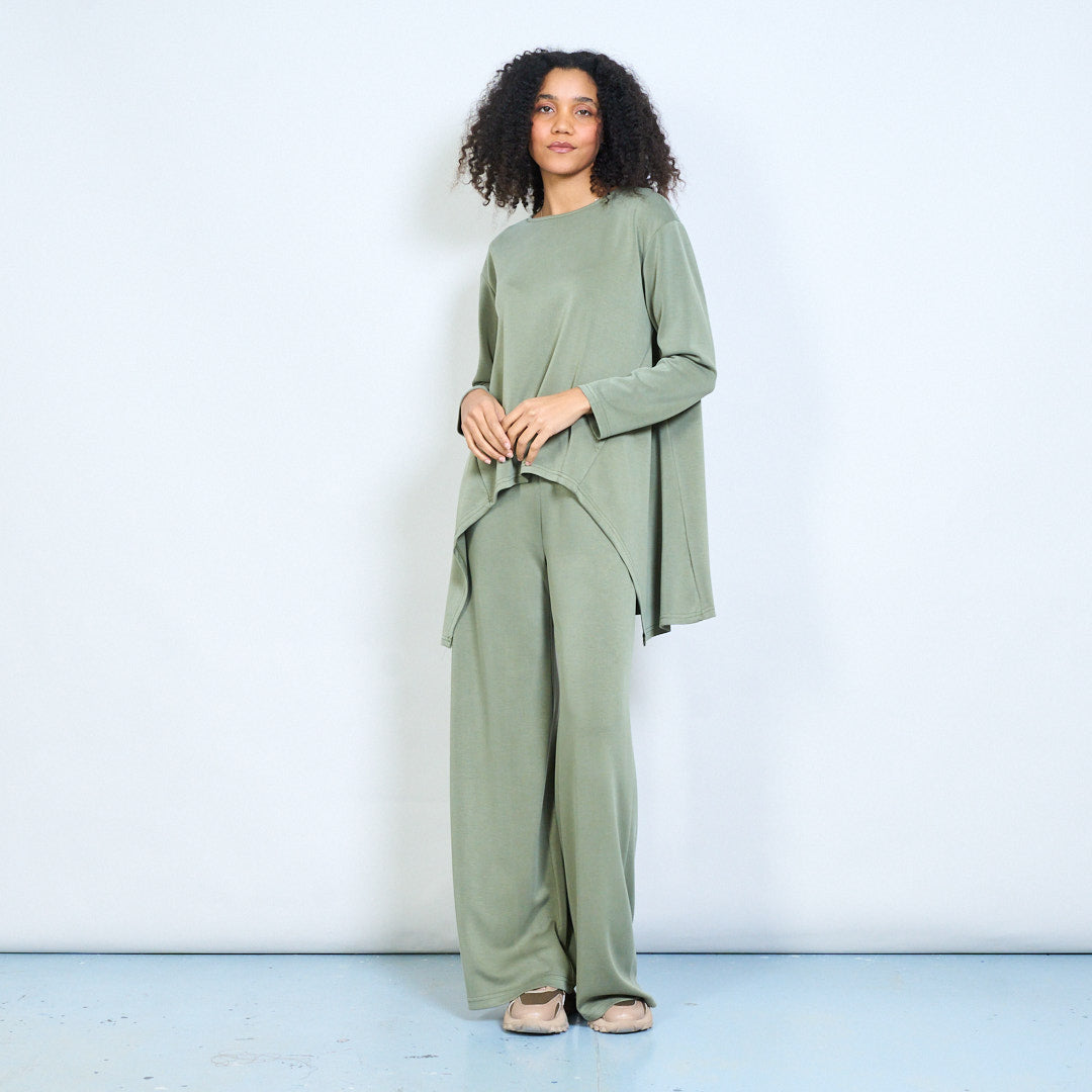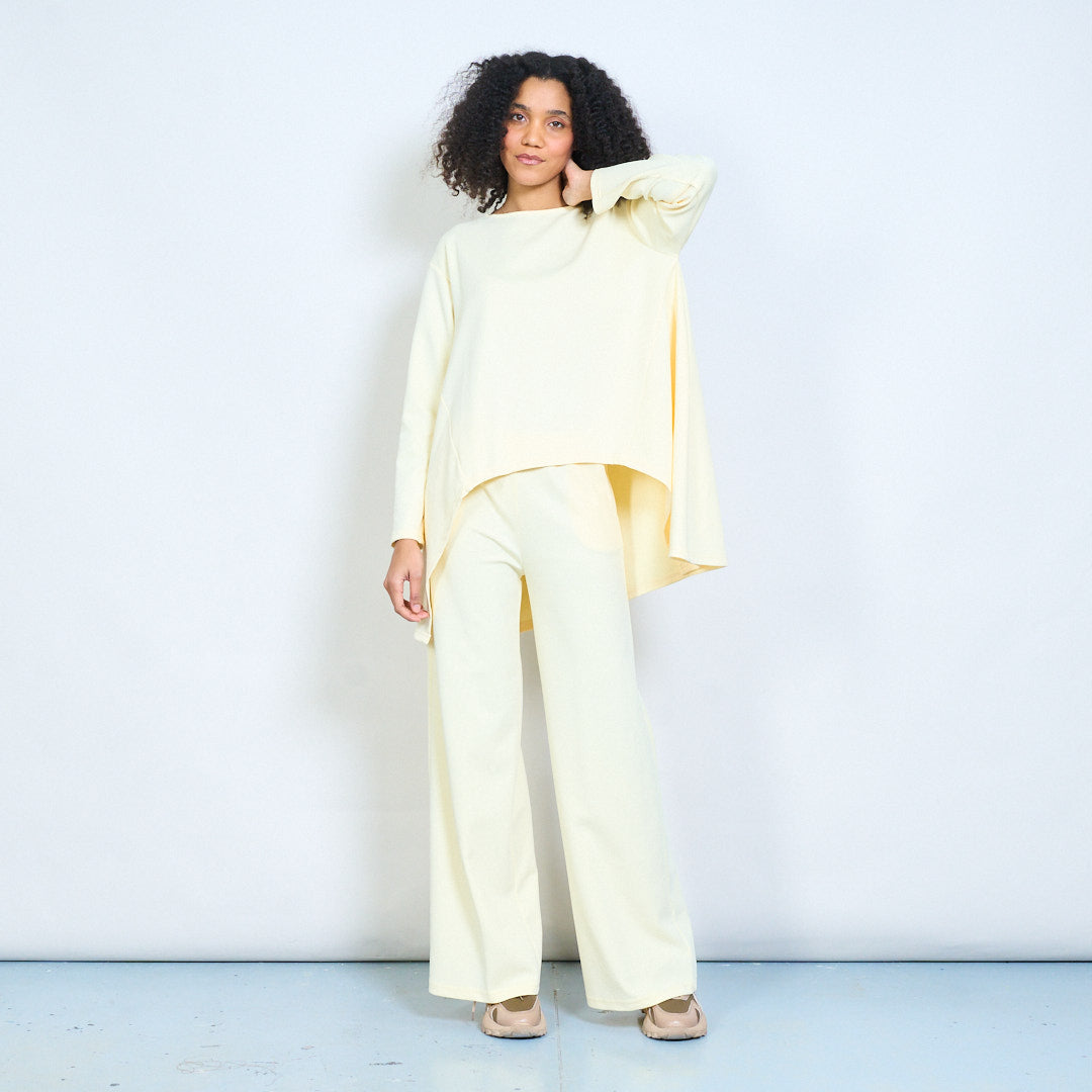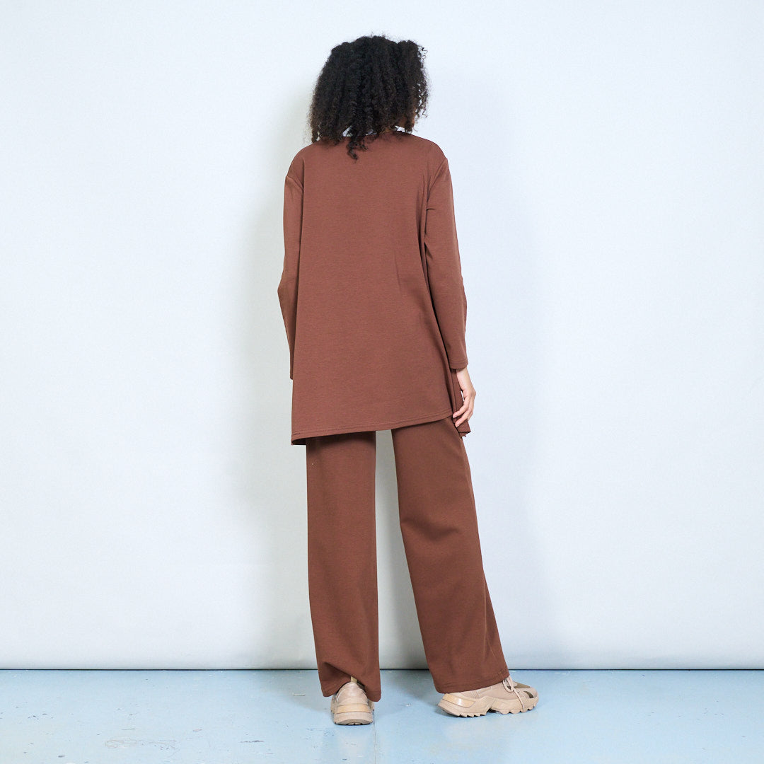 - Augstas jostasvietas platas bikses vienkrāsainā neitrālā tonī