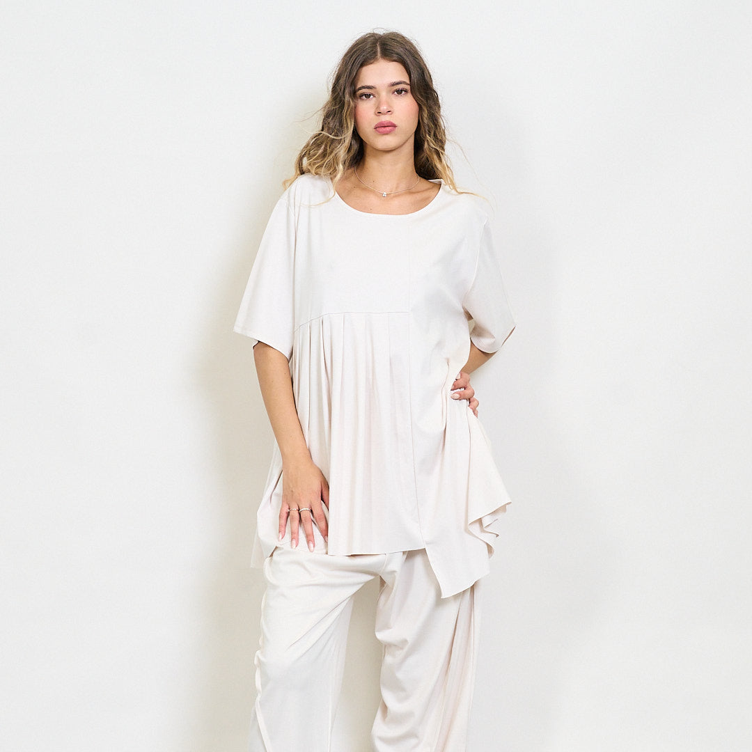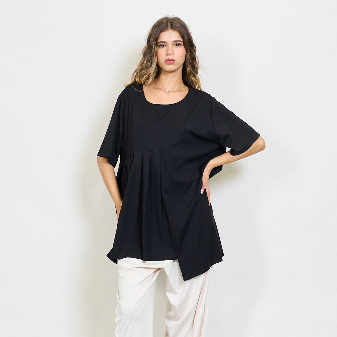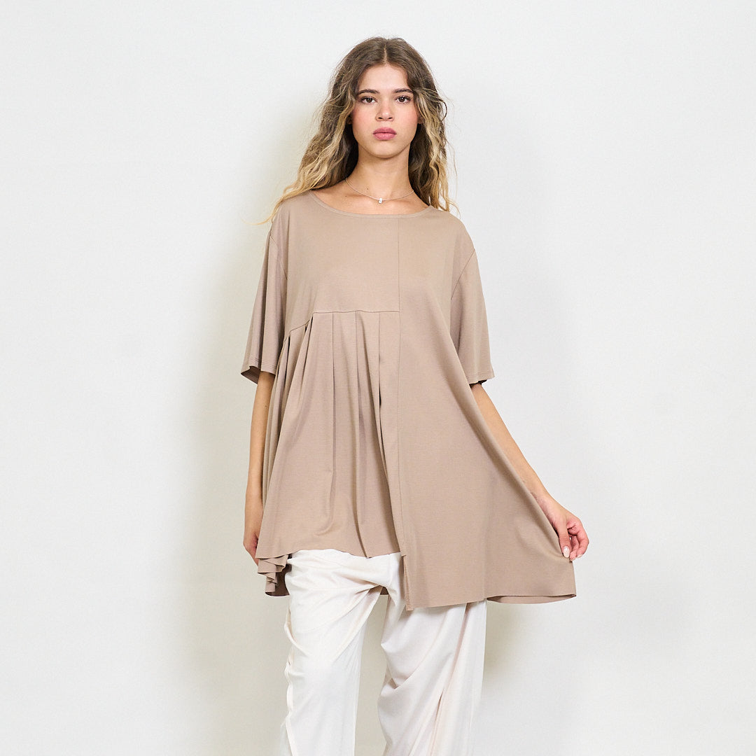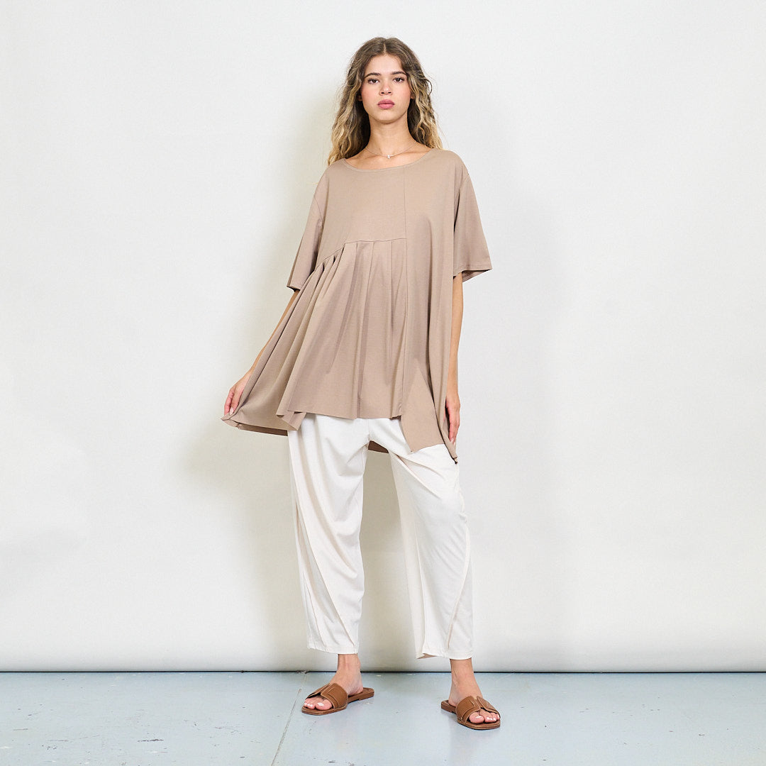 Plūstoša kroku paneļa blūze ar apaļu kakla vairumtirdzniecību