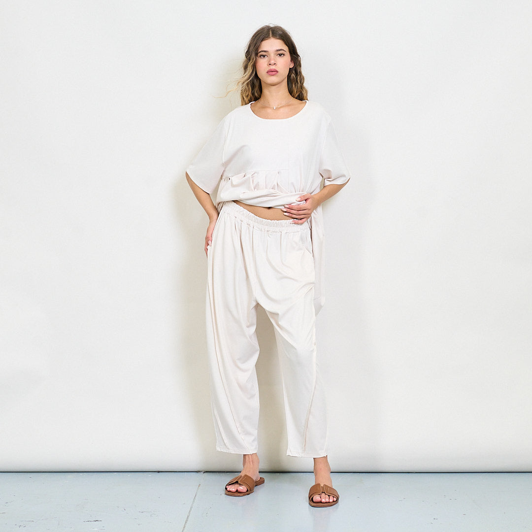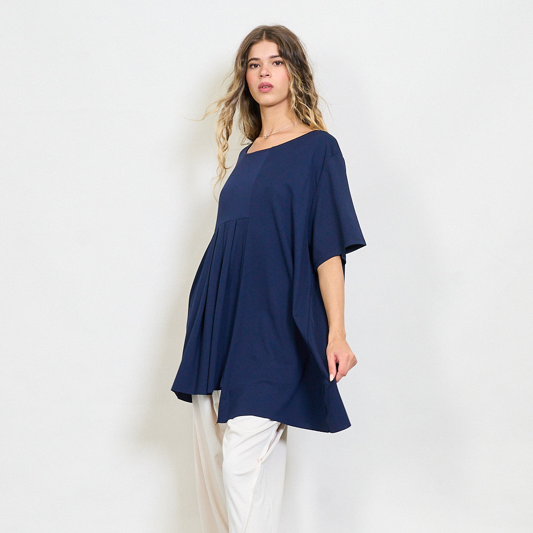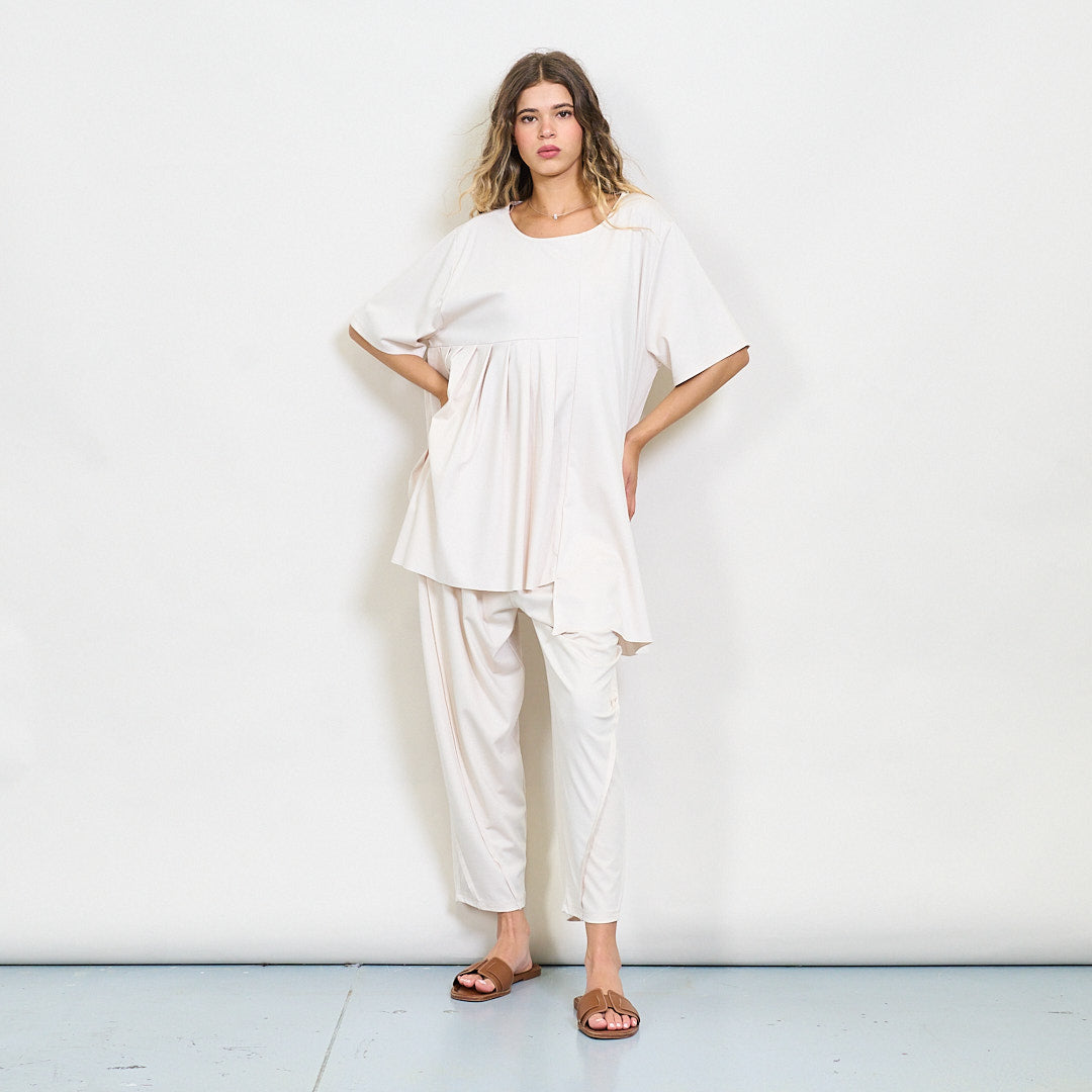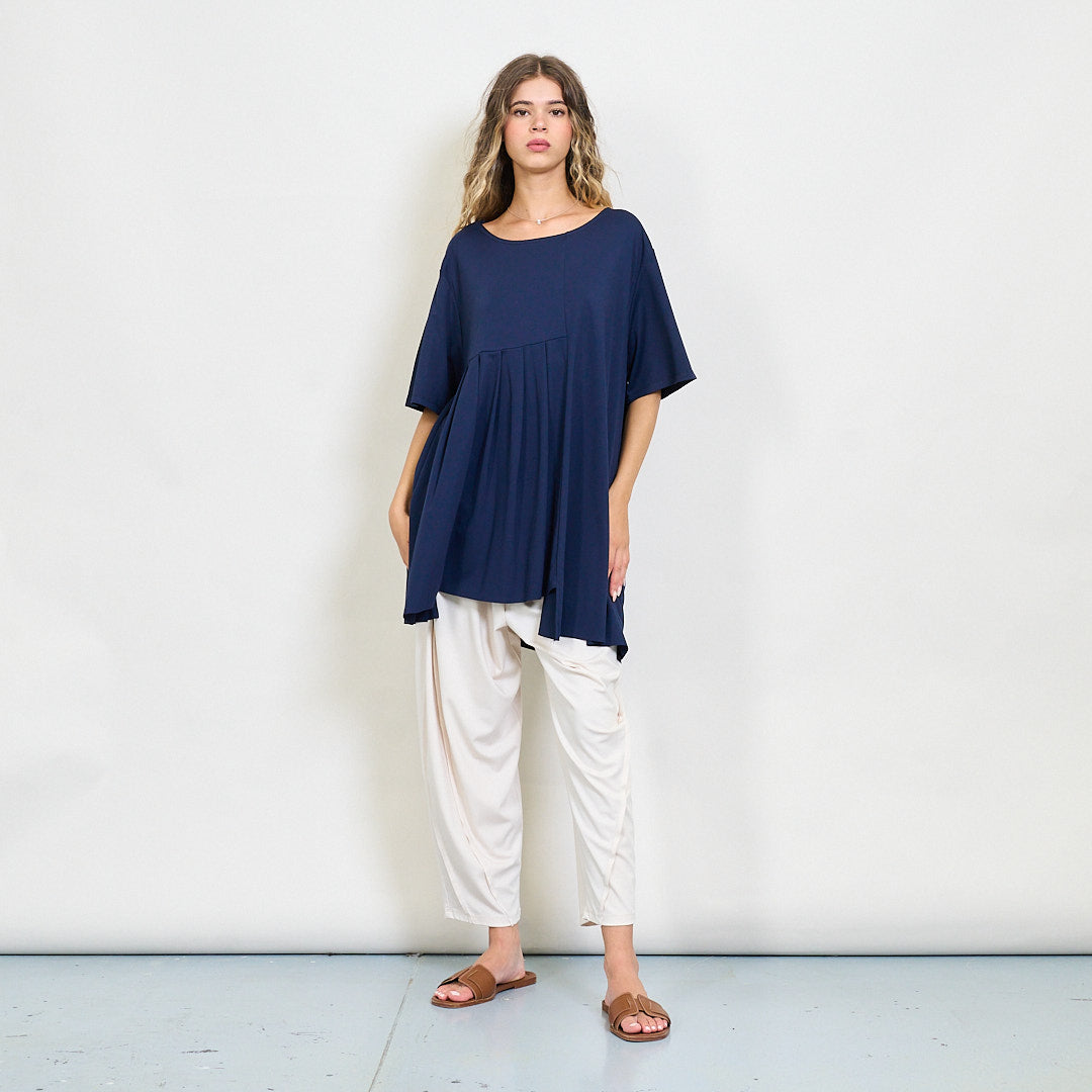 Plūstoša kroku paneļa blūze ar apaļu kakla vairumtirdzniecību