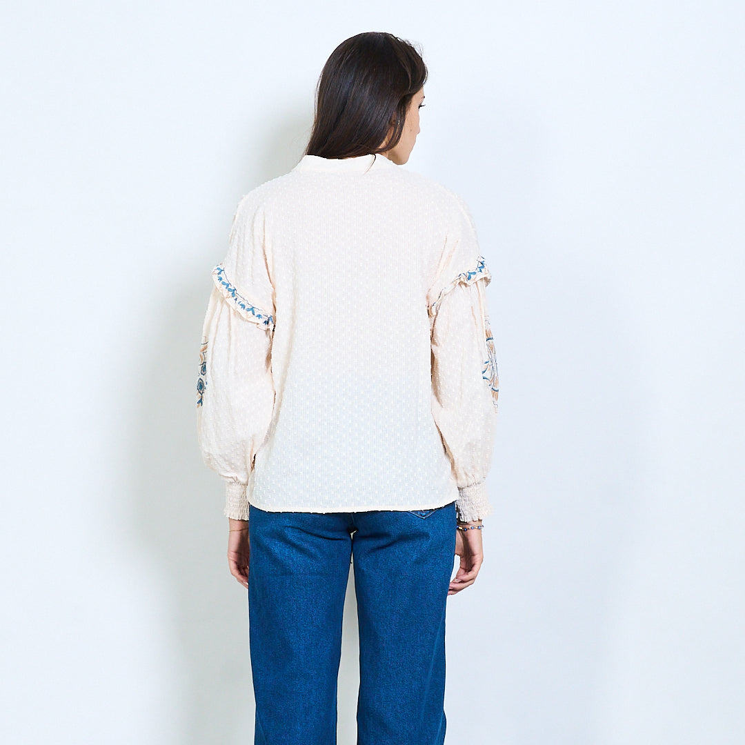 - Sarežģīti izšūti motīvi uz priekšu un piedurknēm