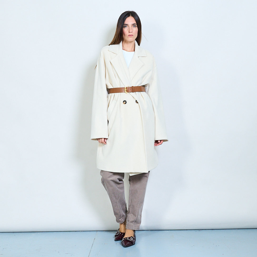 - Pielāgots garais mētelis ar strukturētu atloka dizainu