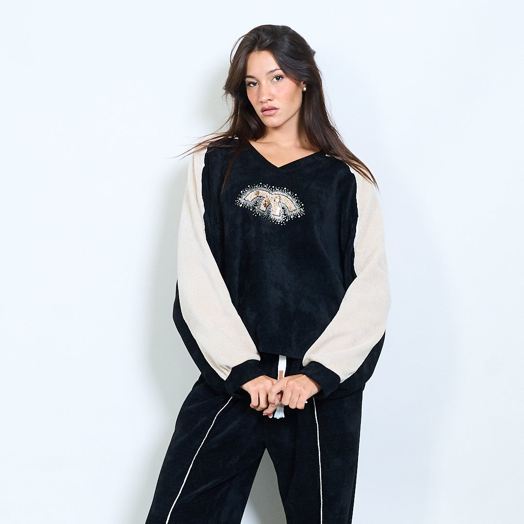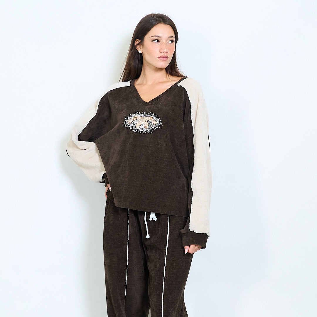 V kakls ar garām piedurknēm krāsu bloka augšdaļa ar izšūtu varavīksnes vairumtirdzniecību