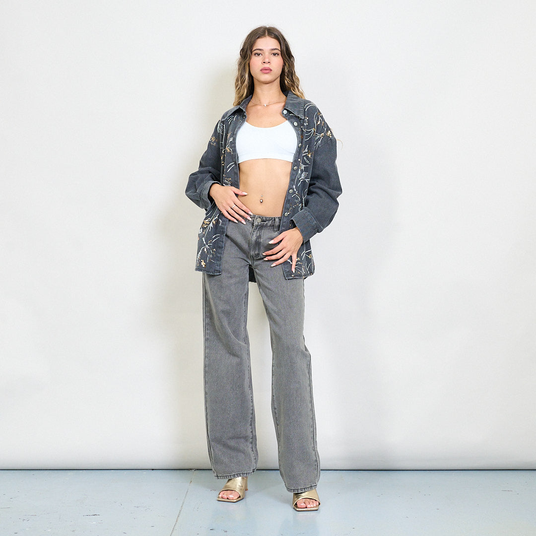 - Vidēja mazgāšanas džinsa ar smalku ziedu fliteru izšuvumu