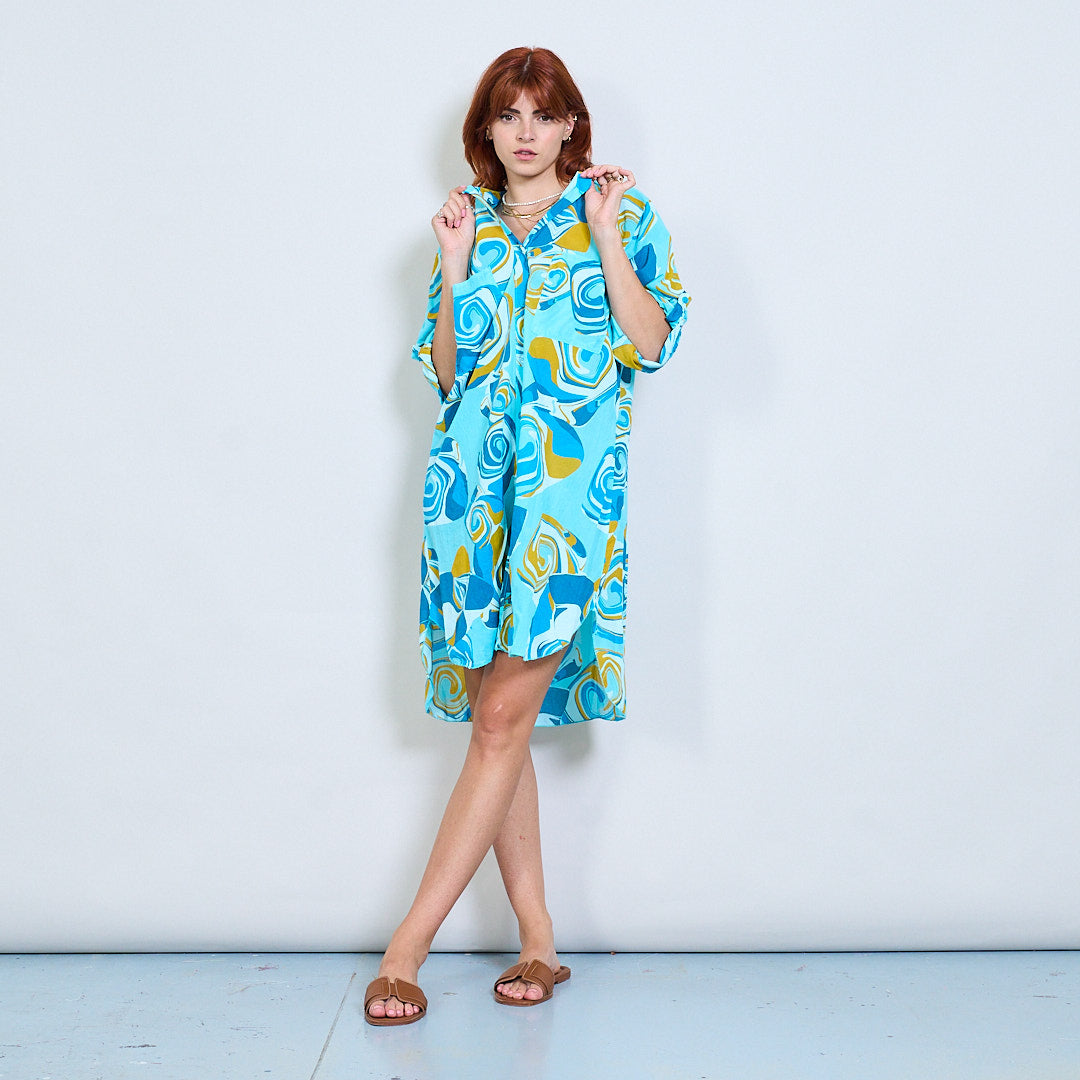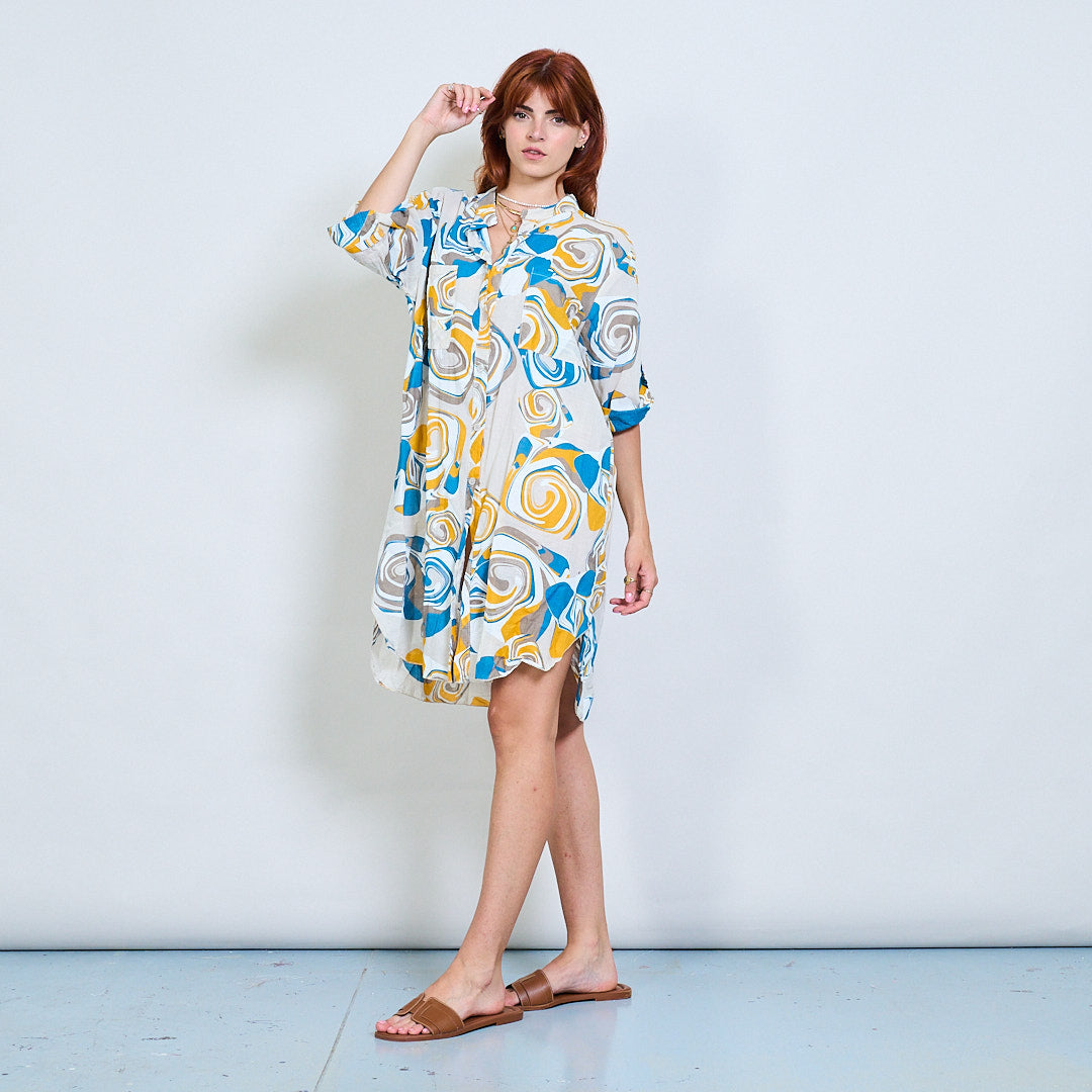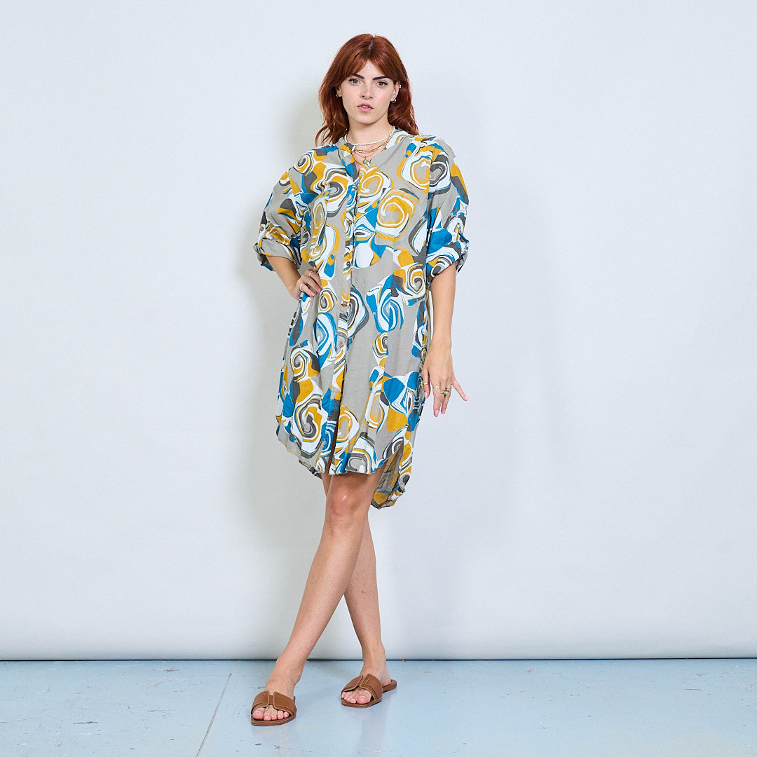 Pārmērīga krekla kleita ar retro virpuļa apdruku un priekšējo kabatas vairumtirdzniecību