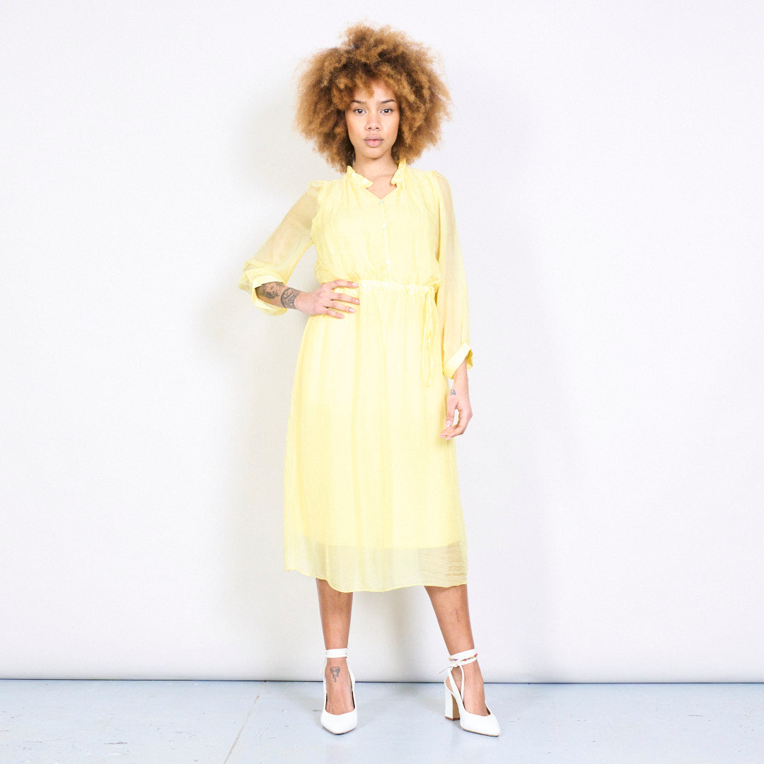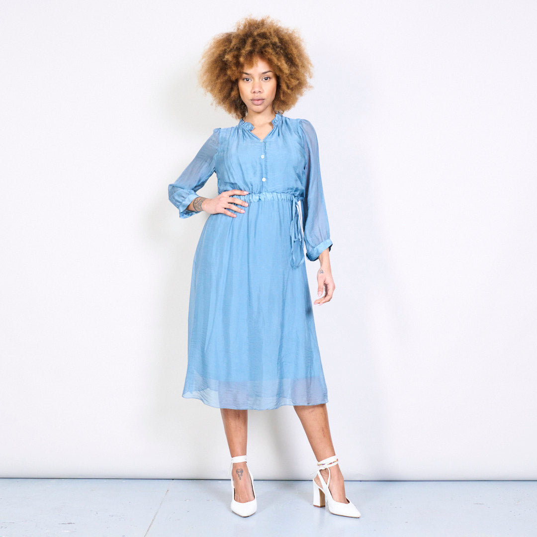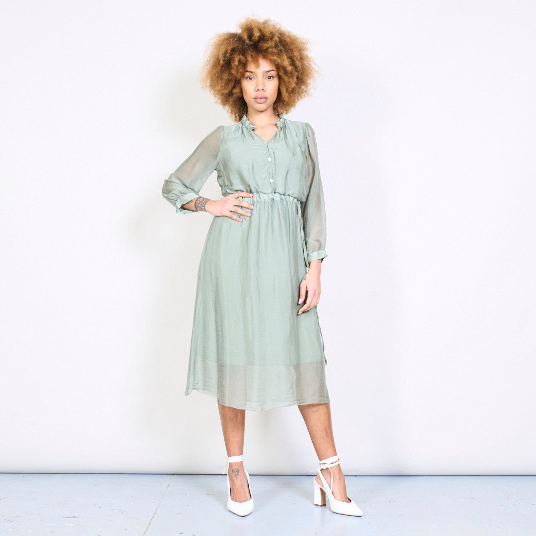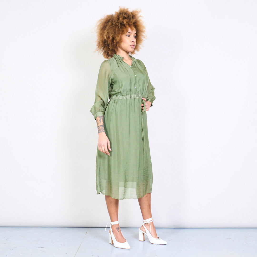 Pogas priekšējā midi slik kleita ar ruffle apkakles vairumtirdzniecību