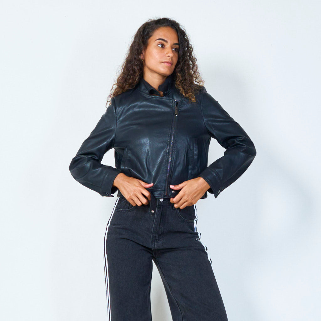 Apgriezta ādas moto jaka ar asimetrisku rāvējslēdzēju vairumtirdzniecībā