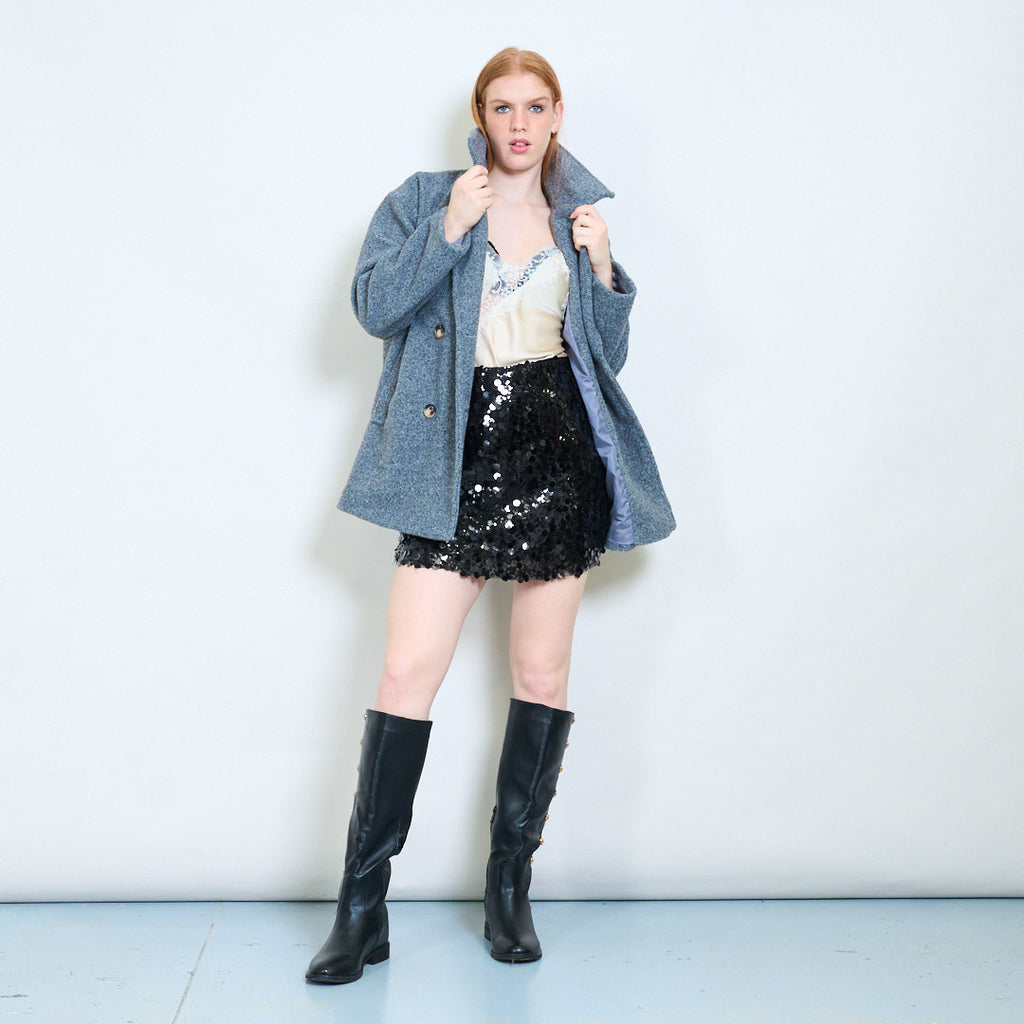 - Liela izmēra atloka apkakle piešķir struktūru un modernu eleganci