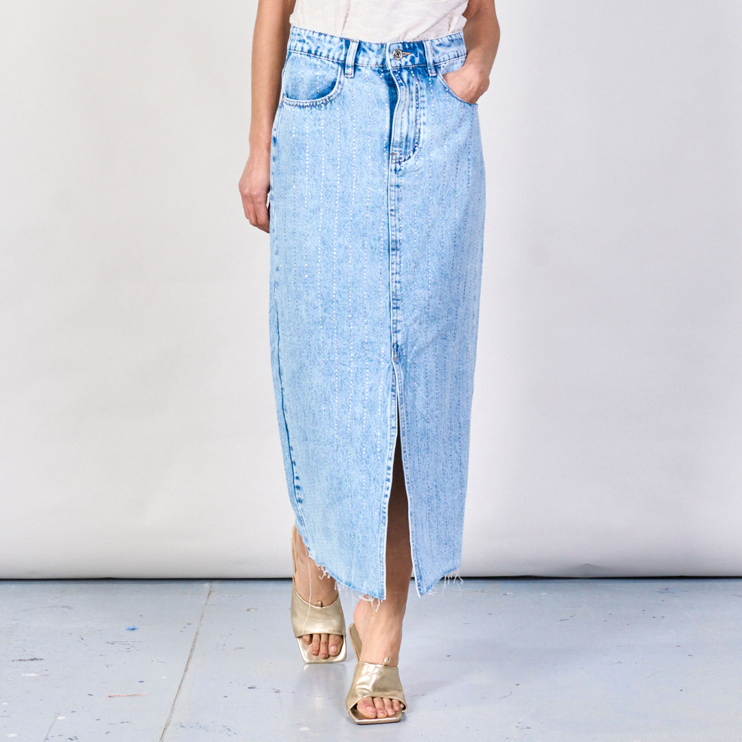 Grūtībās nonākušie MIDI džinsa svārki ar priekšējo spraugu vairumtirdzniecību